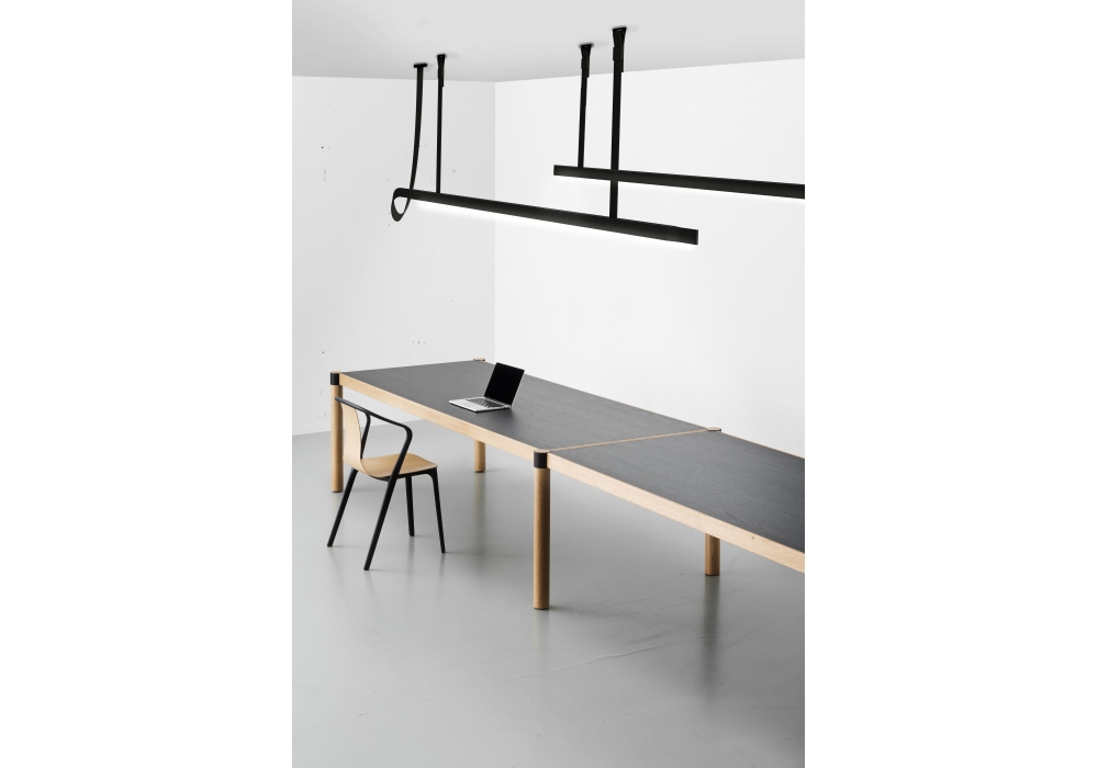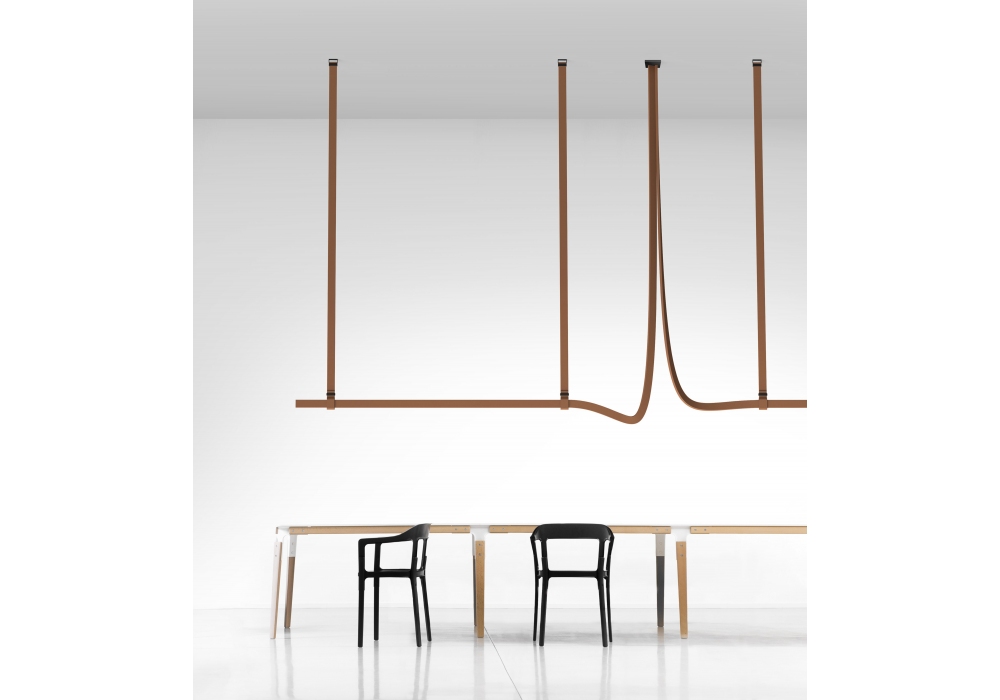 Belt designed by Ronan & Erwan Bouroullec for Flos is a pendant lamp with extruded aluminum structure covered in leather and opal polycarbonate diffuser. Integrated switch (remotely adjustable). LED light source included.
