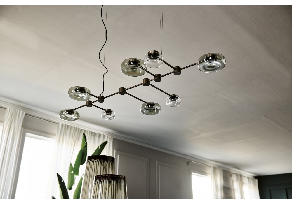 Circuit designed by STC Studio for Cattelan Italia is an integrated LED suspension lamp with frame in titanium embossed lacquered steel and satin Nickel. Lampshades in borosilicate glass: the smaller in transparent colour, the bigger in fumé.
