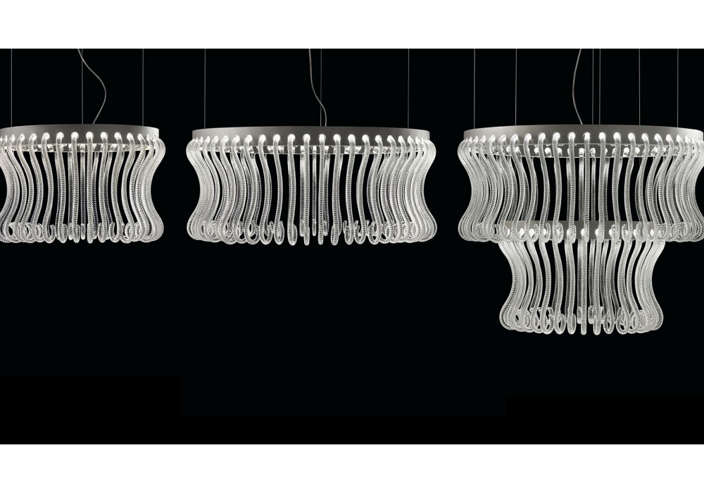 Crown designed by Brian Rasmussen for Barovier & Toso is a pendant lamp with metal supporting structure with gray painted concentric rings. Applications in Venetian glass are anchored in the metal circles which act as real light diffusers illuminated by dimmable LED strips. Crown is available in different sizes.