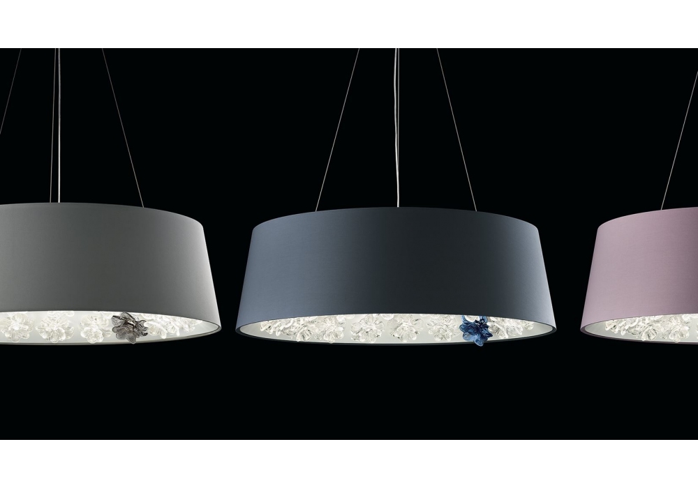 New Eden designed by Daniela Puppa and Francesca Martelli for Barovier & Toso is a pendant lamp with a cylindrical lamp body, supported by three metal rods. The diffuser is the peculiarity of this lamp, a floral composition made of Venetian glass and fencing of the LED-type light sources. New Eden is available in different sizes and finishes.