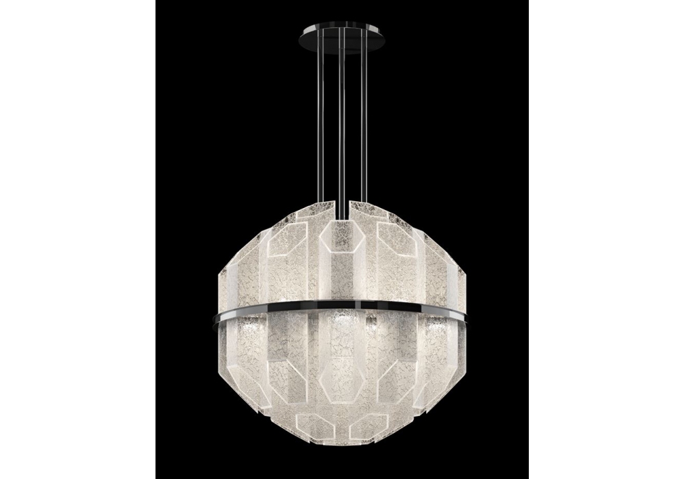 Trim designed and produced by Barovier & Toso is a suspension lamp with supporting structure and details in brushed brass, polished chrome or black chrome colored metal. The diffuser is in Venetian glass structured by various hexagonal elements placed side by side. The light sources used are dimmable LEDs. Trim is available in different finishes and models.