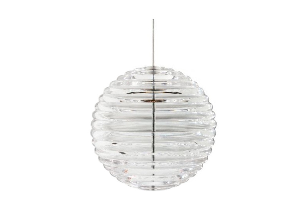Press Sphere designed by Tom Dixon is a suspension lamp made of thick and transparent glass with rounded linear surface detail.