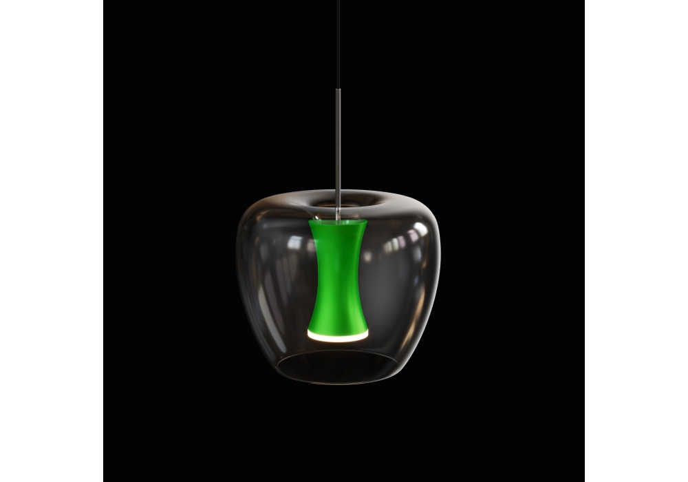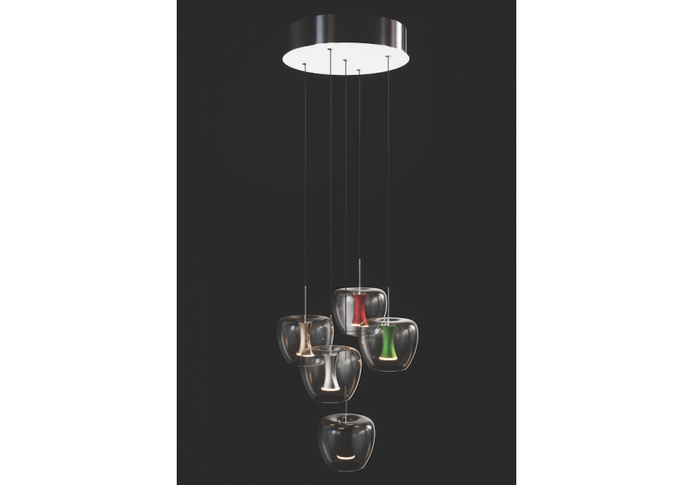 Apple Round designed by Malika Novi for Quasar is a pendant lamp with circular metal rosette. The lamps are circular in shape in glass, with a central core in aluminum painted in different finishes. The light sources adopted are LED type. The power cables are made of black textile fibre. Apple Round is available in different sizes.