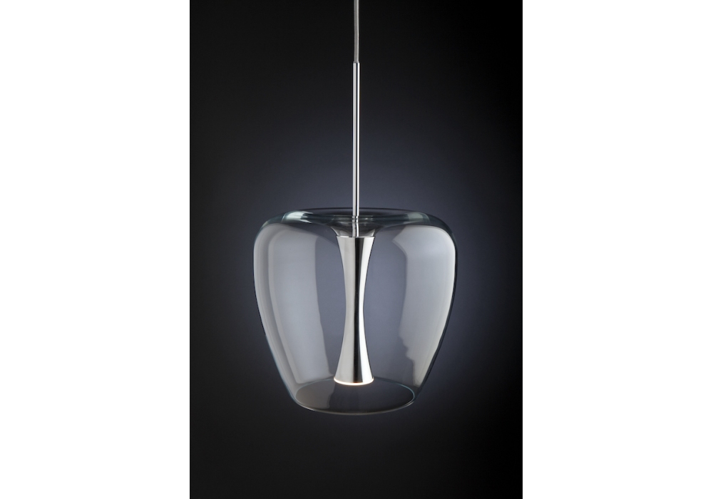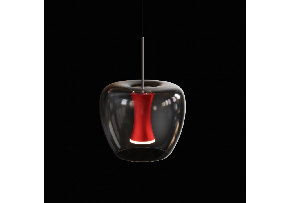 Apple Mood designed by Malika Novi for Quasar is a pendant lamp with a circular glass lamp body and an aluminum core painted in different finishes. The light source is a dimmable LED type, with a black textile fiber power cable and a black circular rosette with chrome plate.