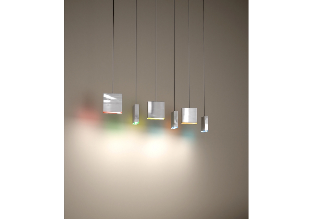 Match Linear designed by Jos Muller for Quasar is a pendant lamp with quadrangular lamp body in polished aluminum. The diffusers are made of acrylic material and adopt an LED light source in the colors; red, orange, yellow, green, blue or transparent. Match Linear is available in five different models and sizes.