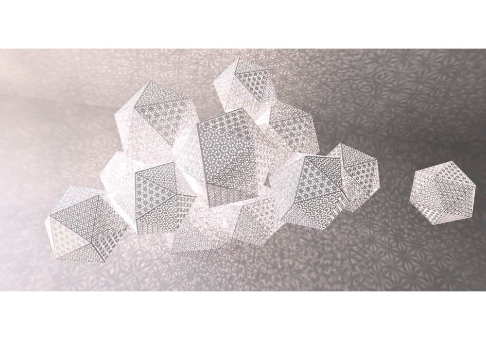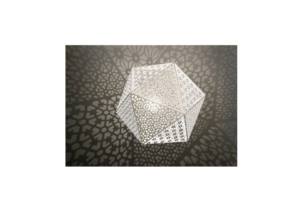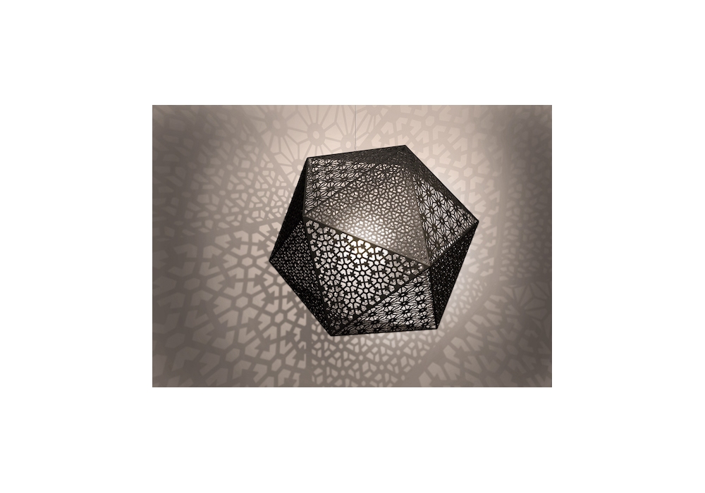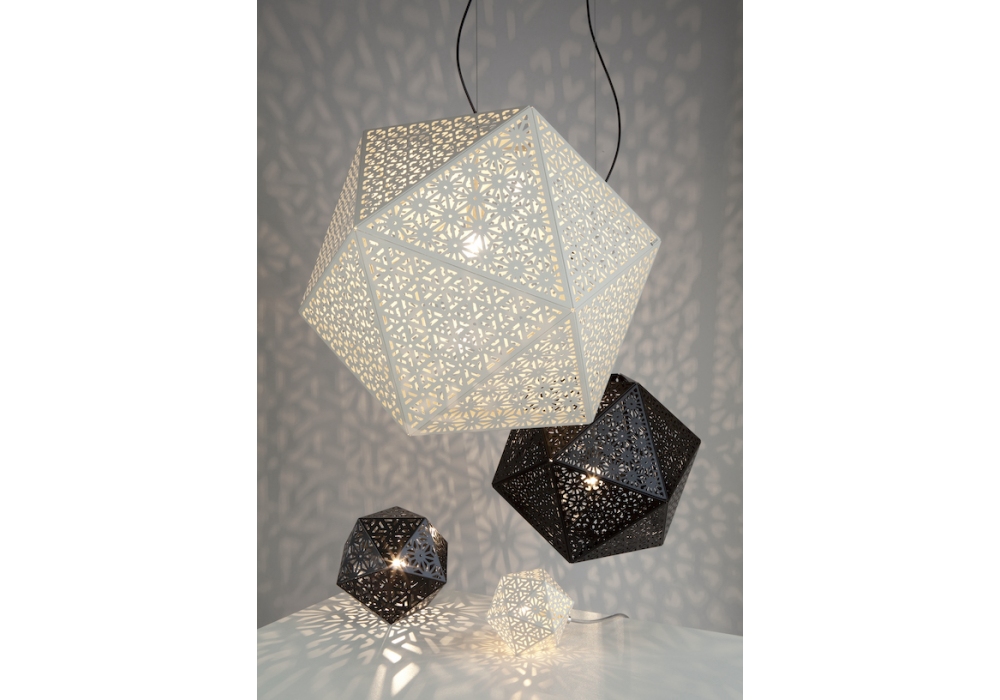 Rontonton designed by Edward van Vliet for Quasar is a pendant lamp with circular rosette. The lamp body has a polyhedral shape with a painted metal structure. The light source is halogen or LED with a transparent power cable for the 15 and 22 version and black for the 50 and 75 version. Rontonton is available in different models and finishes.