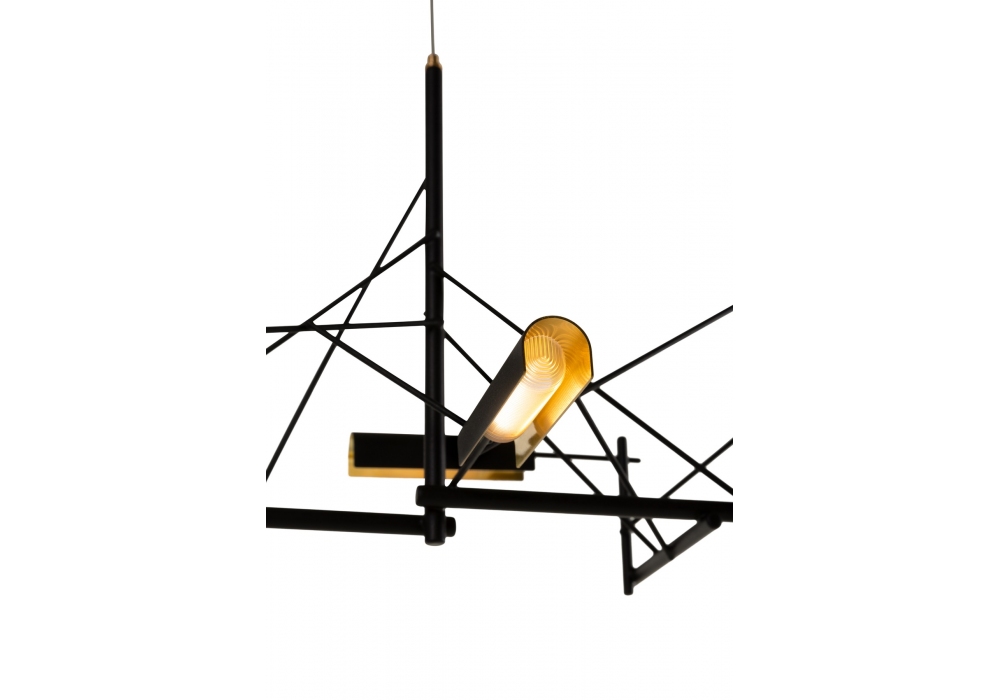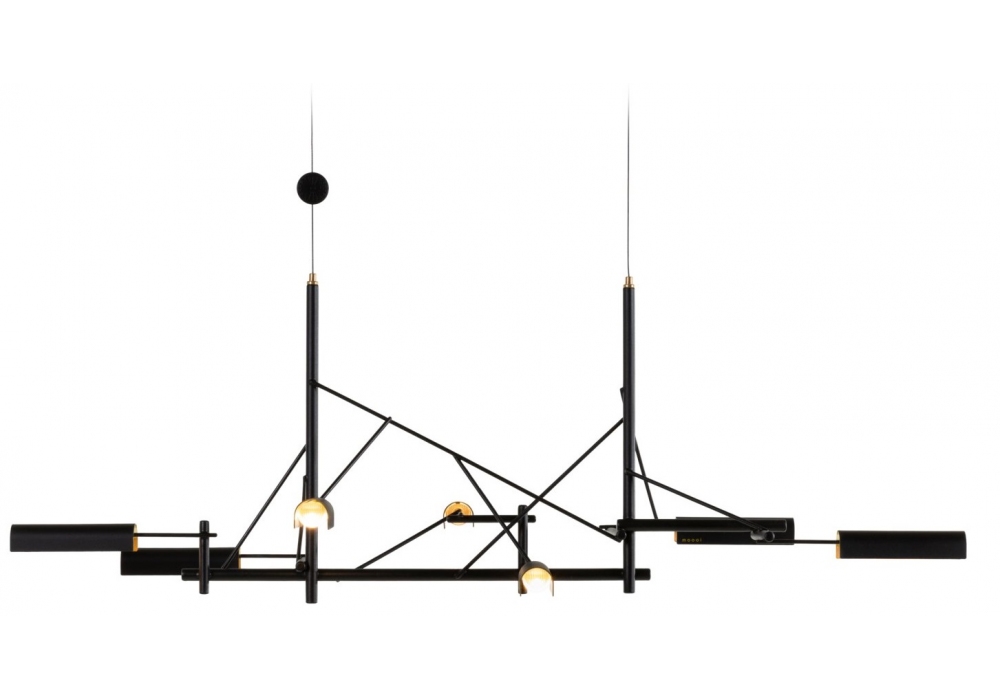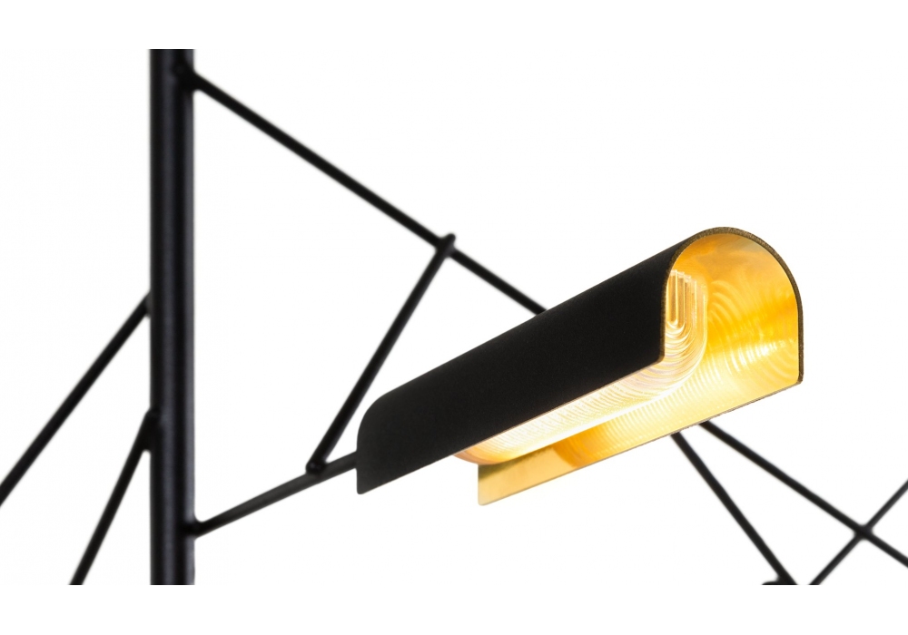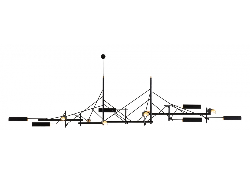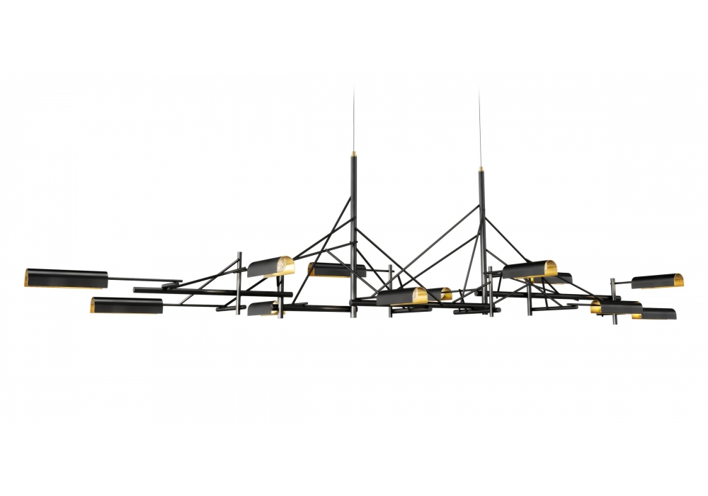 Tinkering designed by Joost van Bleiswijk for Moooi is a suspension lamp made of metal frame, polycarbonate diffusers and brass shades. Available in two sizes with 7 or 12 LED light sources. Tinkering is powered through Electrosandwich® technology by Marcel Wanders.