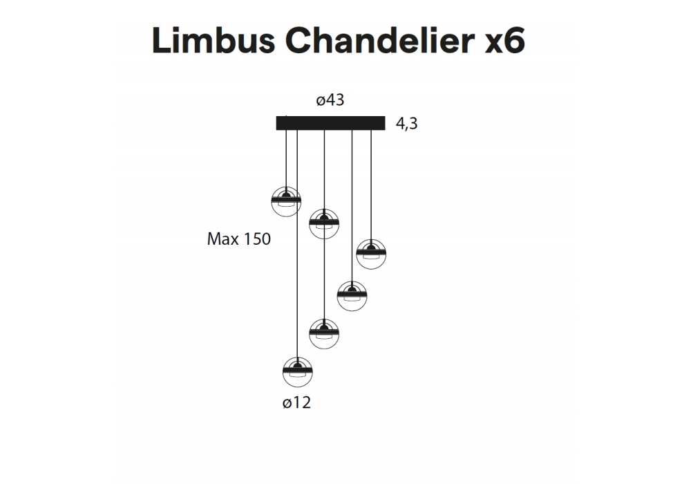 Limbus Chandelier designed by Emanuele Ricci for Lumina is a pendant lamp with circular canopy in painted metal and suspension cables in plastic material. The lamp holder is in turned anodized aluminum in different finishes. The lamp body is spherical in glass and adopts a dimmable LED light source.