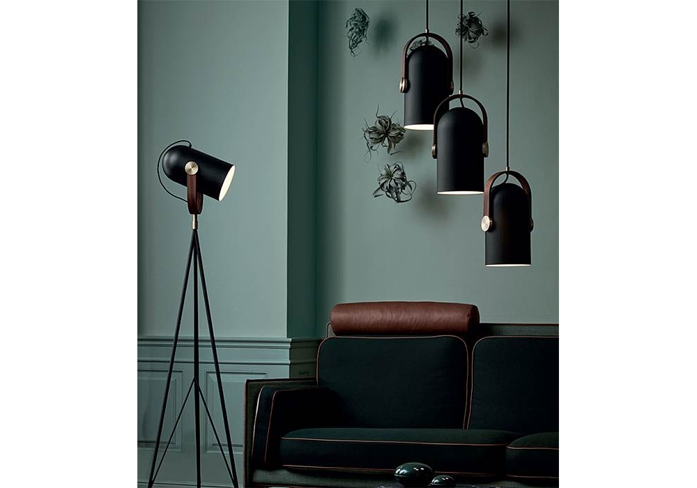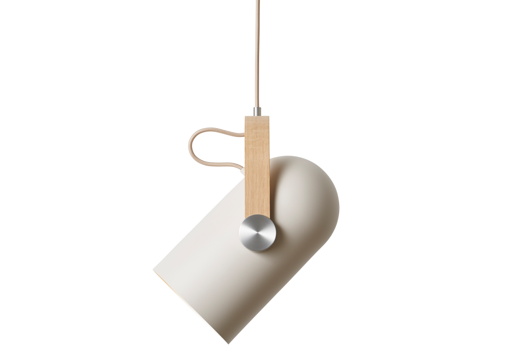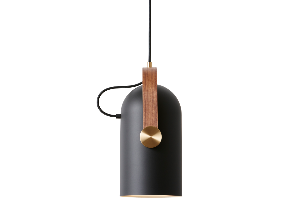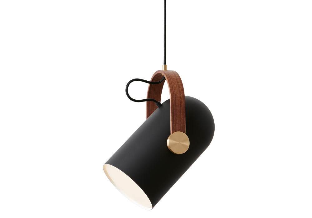 Carronade Spot designed by Markus Johansson for Le Klint is a suspension lamp structured by the combination of metal and wood. The lampshade is in cylindrical aluminum supported by a bracelet in oak or American walnut with details and support screws in brass or aluminum. The light source used is LED or halogen (not included) powered by a textile fiber cable of the same color as the lampshade. Carronade is available in two different sizes and finishes.