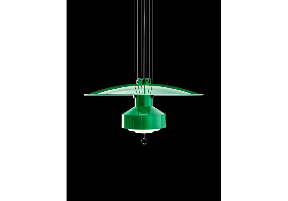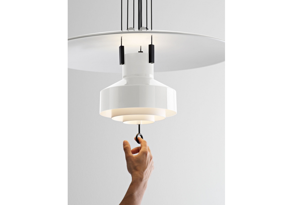 Saliscendi designed by Achille and Pier Giacomo Castiglioni for Stilnovo is a pendant lamp made of metal and plastic material. The body of the lamp is composed of two main elements: a fixed diffuser with a circular shape in metal and a central body that can be positioned in different ways, thanks to a practical grip and an ingenious pulley system. The light source is a dimmable, double emission LED. Saliscendi is available in three different finishes: gray / white, red / white and green / white.