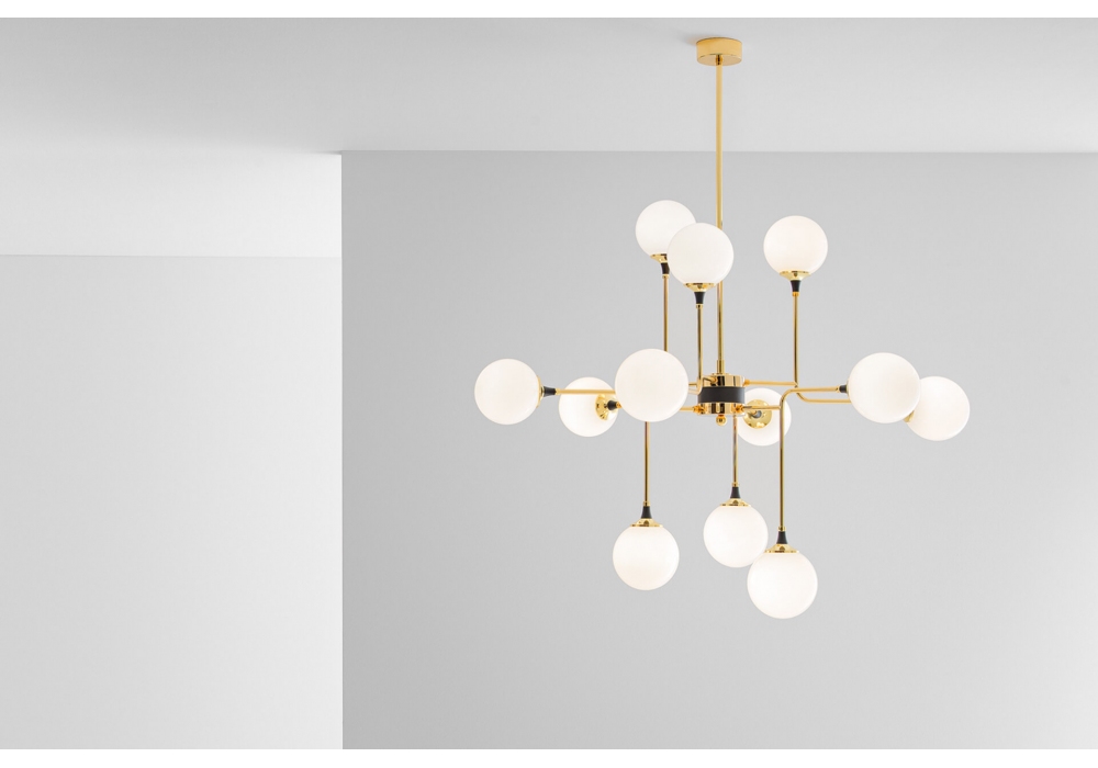 Galassia designed and produced by Stilnovo is a pendant LED lamp with supporting structure in tubular brass treated with a galvanic process. The diffusers are spherical in white triplex glass. Galaxy is available in two different sizes.