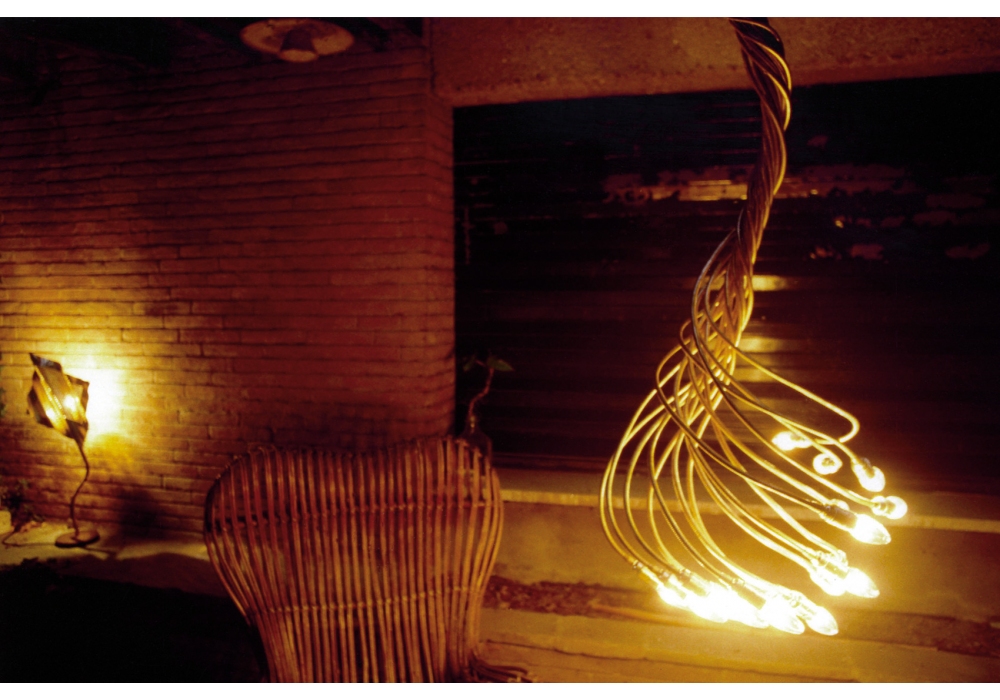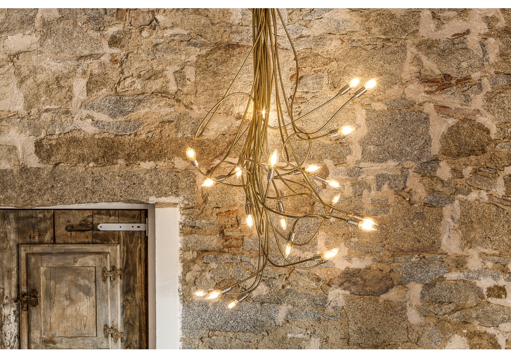 Turciù 16/21/36 designed and produced by Catellani & Smith is a suspension lamp with satin metal base, moldable flex in brass or nickel. It is available in three models, with different amounts of flex and diffusers. Dimensions vary from model to model.