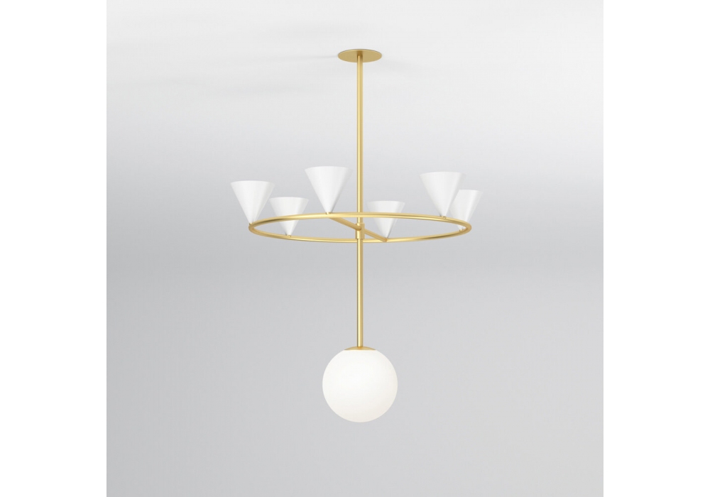 Cones On A Ring designed by Atelier Areti is a pendant lamp made of painted metal or brushed brass and white glass cones.