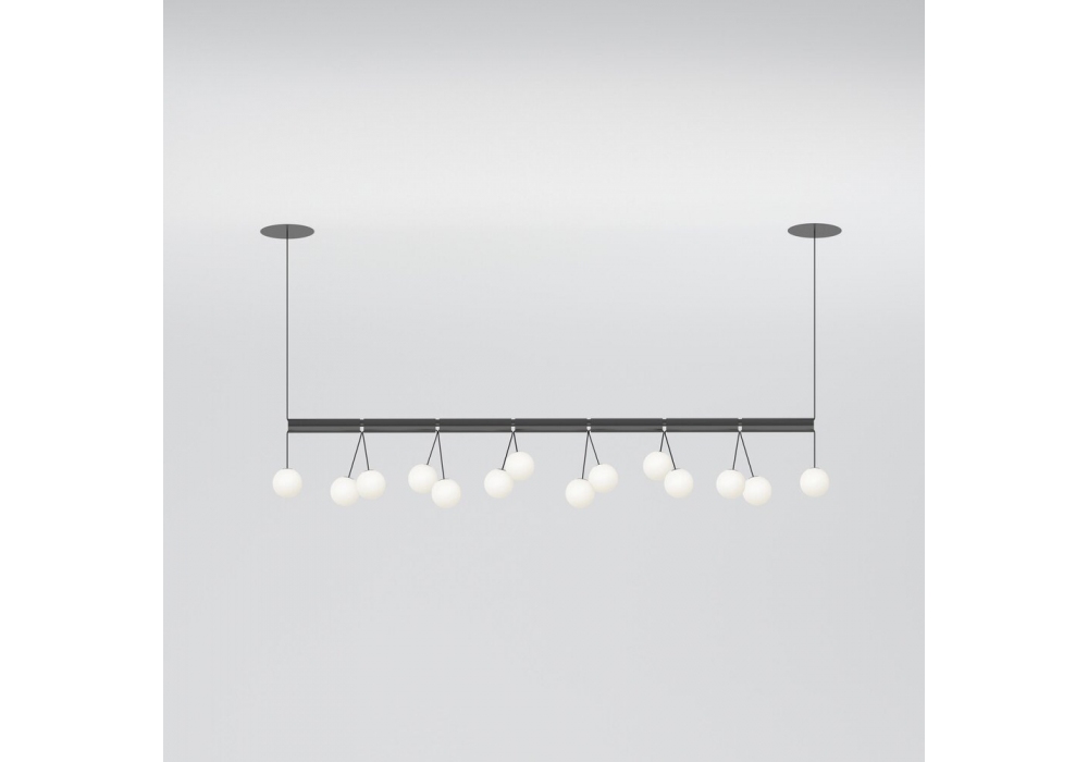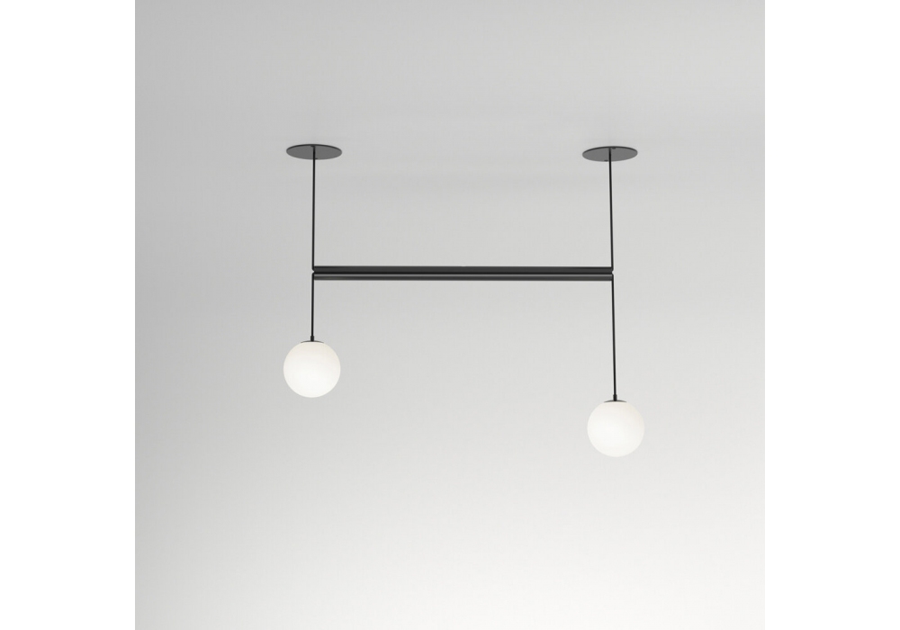 Tube with Globes designed by Atelier Areti is a suspension lamp made of painted metal or brushed brass. Available in two models.
