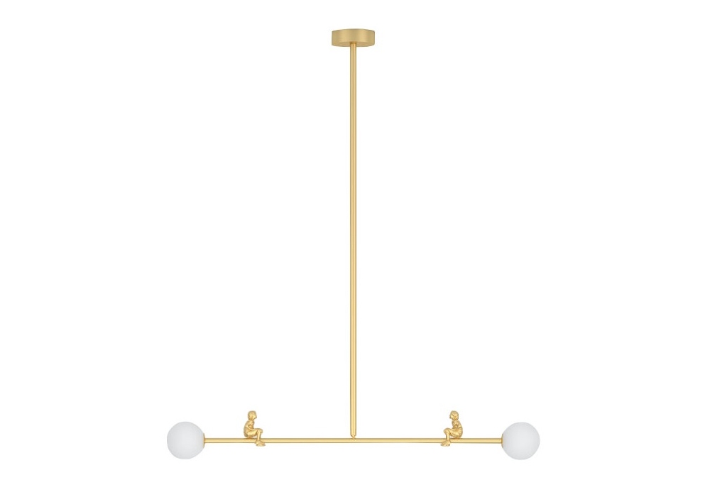 See Saw designed by Atelier Areti is a suspension lamp made of brushed brass and white glass diffusers.