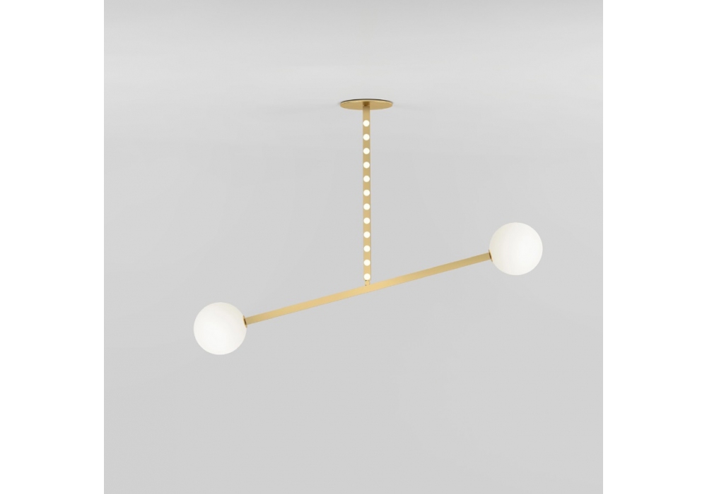 Linetype Tube designed by Atelier Areti is a suspension lamp made of brushed brass, white acrylic panels and white glass globes.