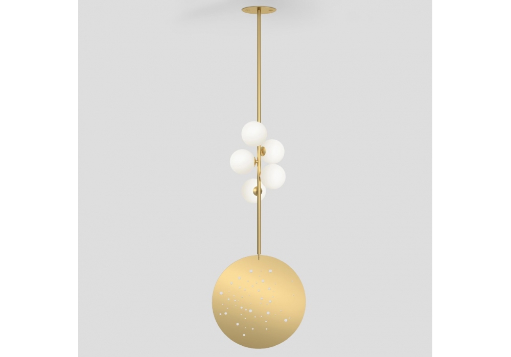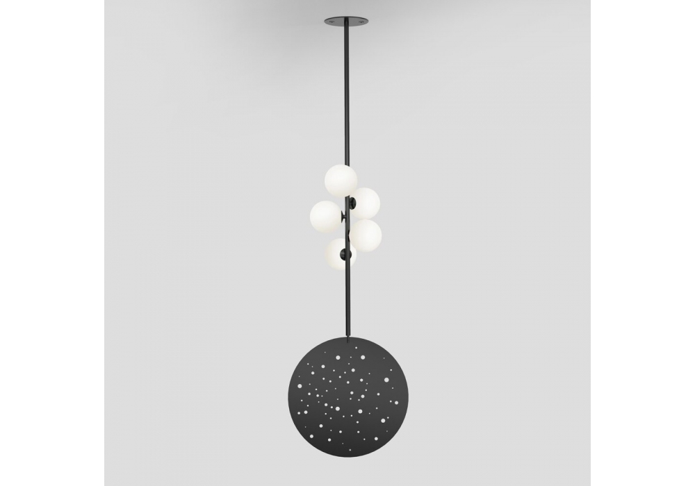 Epic Four designed by Atelier Areti is a pendant lamp made of brushed or black painted brass, white glass diffusers. Available in two models.