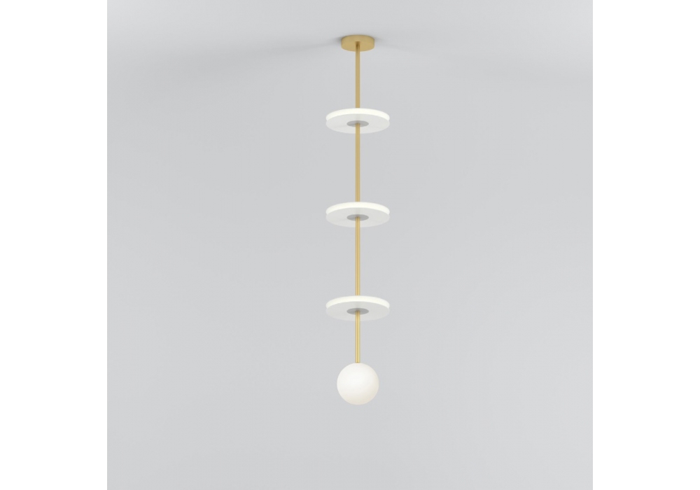 Discs Stacks Long designed by Atelier Areti is a pendant lamp made of brushed brass and a white glass globe. Available with brass or white acrylic discs.