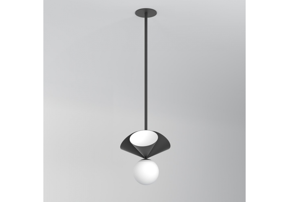 Globe with three Cones designed by Atelier Areti is a pendant lamp characterized by a tube and attachment available in brushed brass or black painted. Black cones with white reflector.