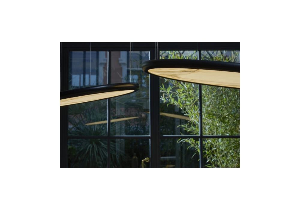 Bogotà designed by Massimiliano Raggi for Contardi is a pendant lamp structured by a black lacquered ellipsoidal wooden ring. The lampshade is made of Vienna straw or fabric and shields an LED light source. Bogotà is available in different sizes, finishes and versions.
