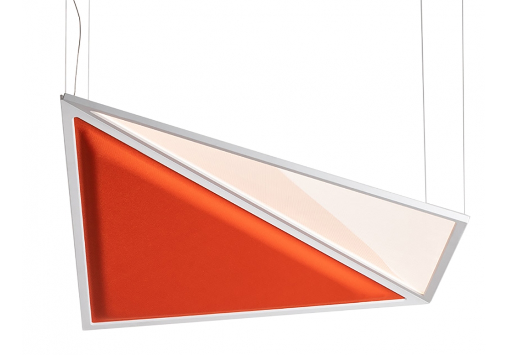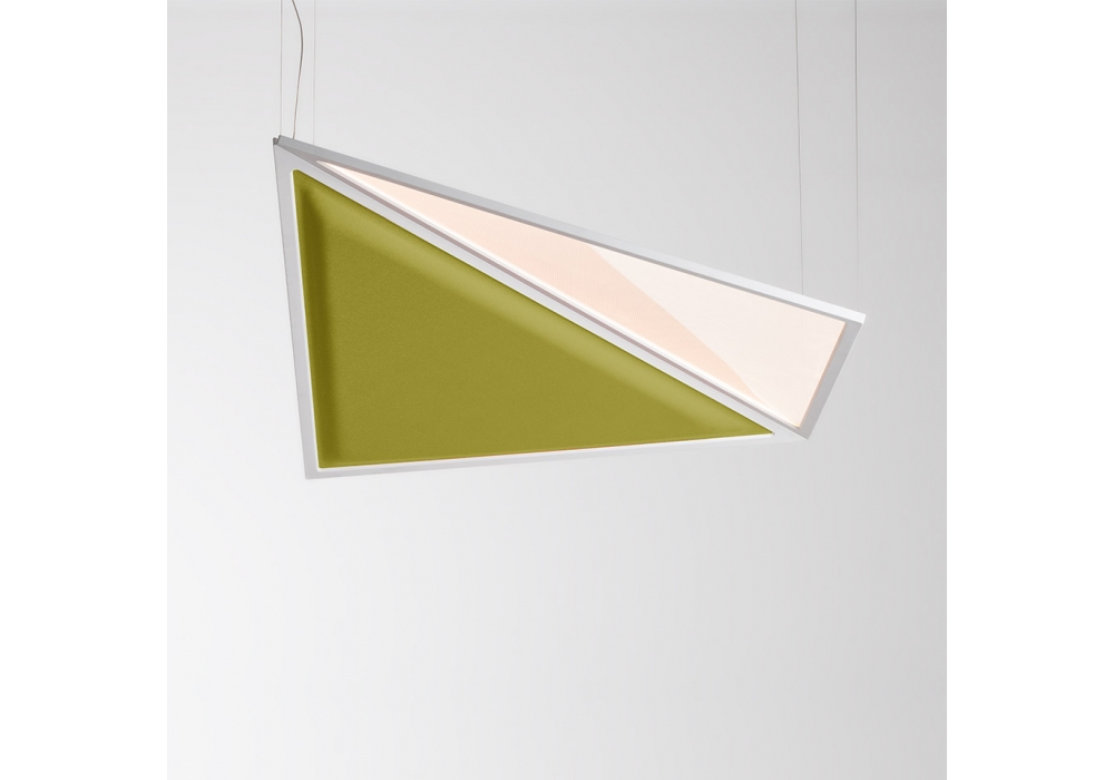 Flexia designed by Mario Cucinella for Artemide is a pendant lamp with an abstract polygonal shape structure in aluminum and sound-absorbing panels in PET. The light source is a dimmable LED type available in the Artemide App or Push/1-10/Dali version. Flexia is available in different finishes.