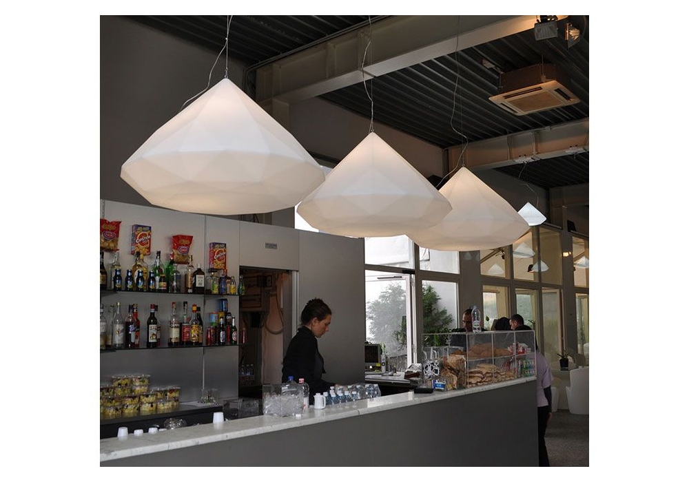Bijoux designed by Buro Fur Form is a polyethylene pendant Lamp that recalls the shape of a diamond: the diffused light it emanates makes it a brilliant that embellishes indoor and outdoor spaces. Available in 2 sizes