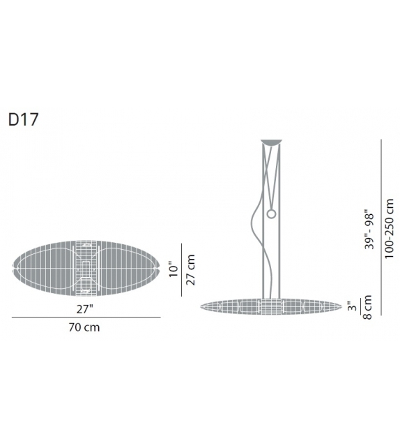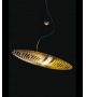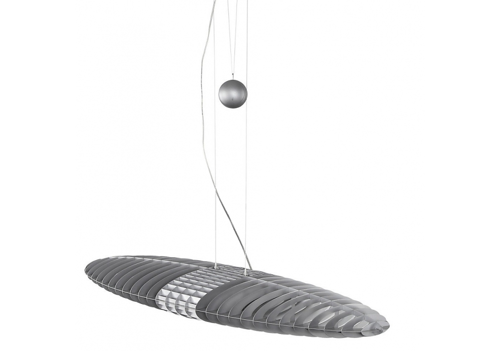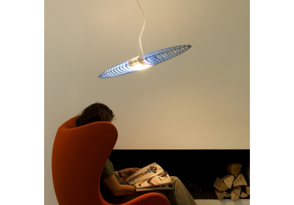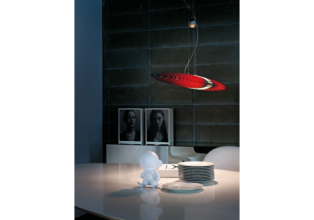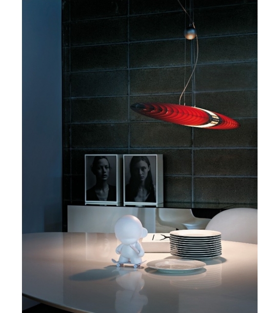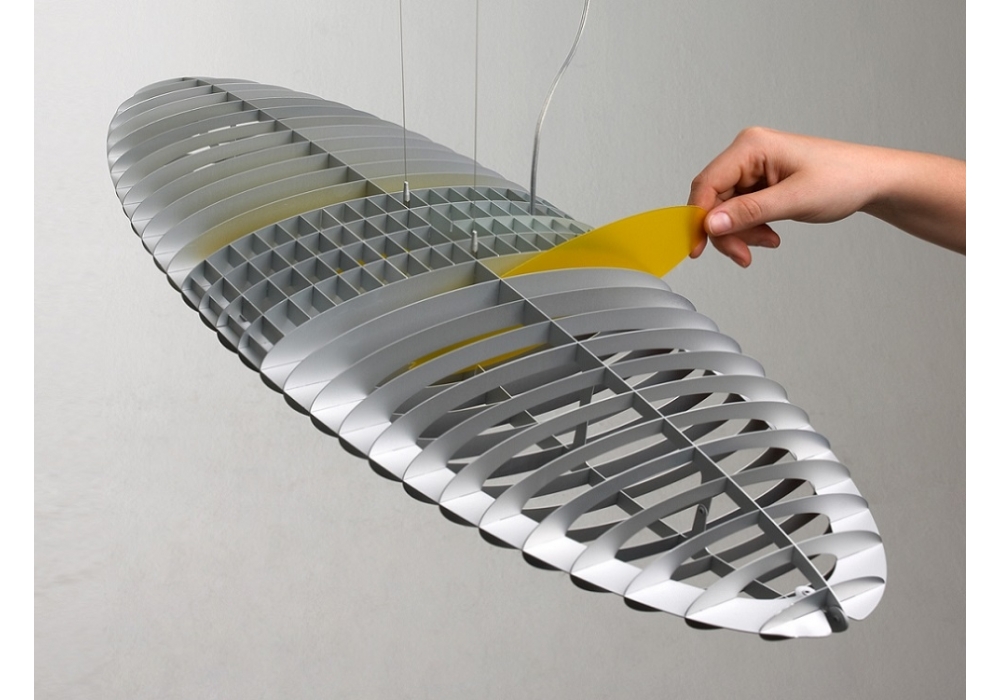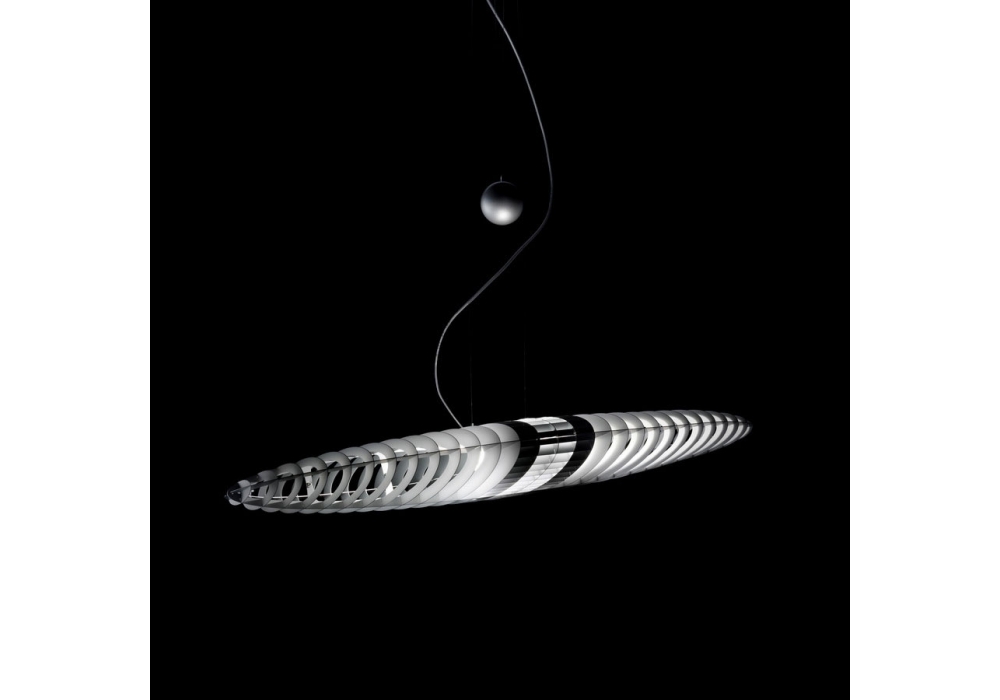 Titania designed by Alberto Meda and Paolo Rizzatto for Luceplan is a suspension lamp with lamellar aluminum casing and lead counterweight that allows up and down adjustment. It is equipped with five pairs of filters in yellow, blue, purple and pink which determine the different chromatic shades of the lamp without interfering with the emission of white light.