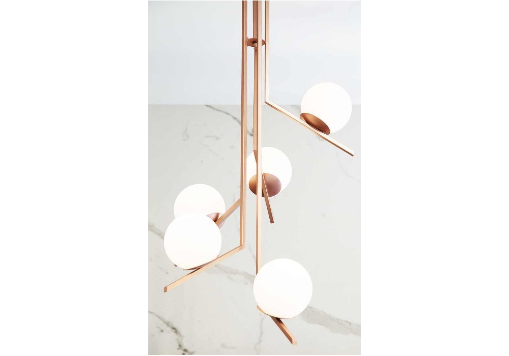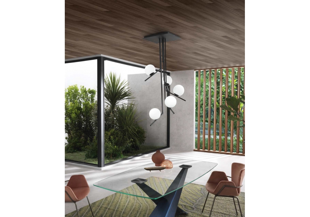 Dodo S designed by Riflessi is a pendant lamp made up of painted metal rods with attachment to the ceiling. The light source comes from white satin glass bulbs. Available in different finishes and models.