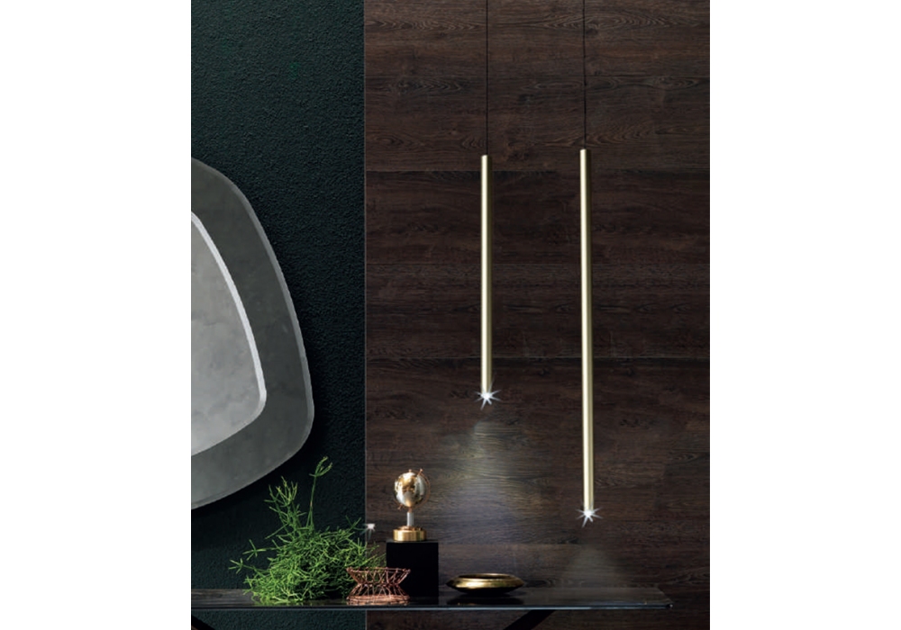 Stilo SS designed by Riflessi is a pendant lamp formed by a tubular metal painted with galvanic satin treatment, available in three different heights. Ceiling attachment in graphite finish. Electric cable in black fabric adjustable in height max. 120 cm.