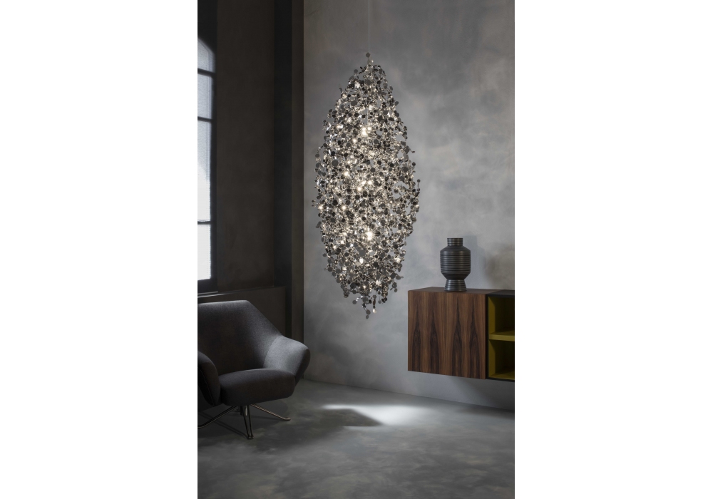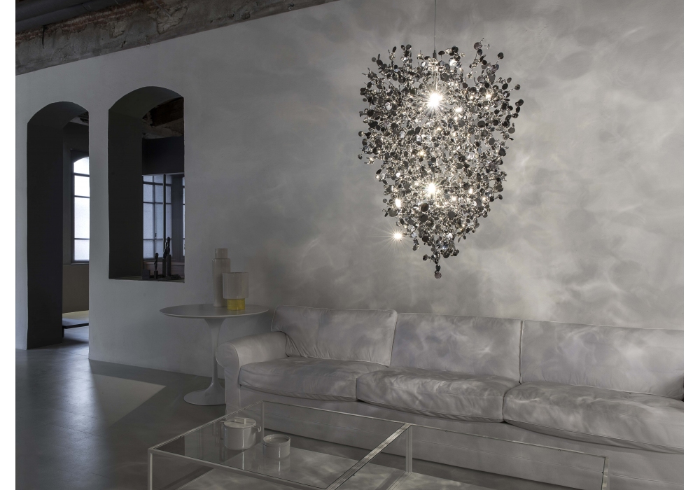 Argent designed by Dodo Arslan for Terzani is a chandelier with a painted metal canopy and pendants structured by multiple applications in plated steel. The light source adopted is integrated LED and dimmable in different shades of light. Argent is available in various models and finishes.