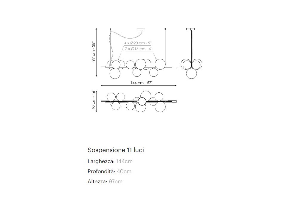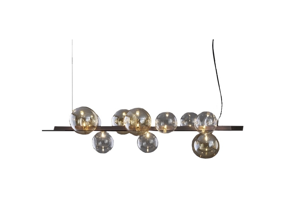Bon Ton 11 designed by Studio Team Design for Bonaldo is a suspension lamp with lampshades of different sizes and colors (4 amber glass spheres and 7 transparent glass spheres). The structure is made of metal, in two finishes.