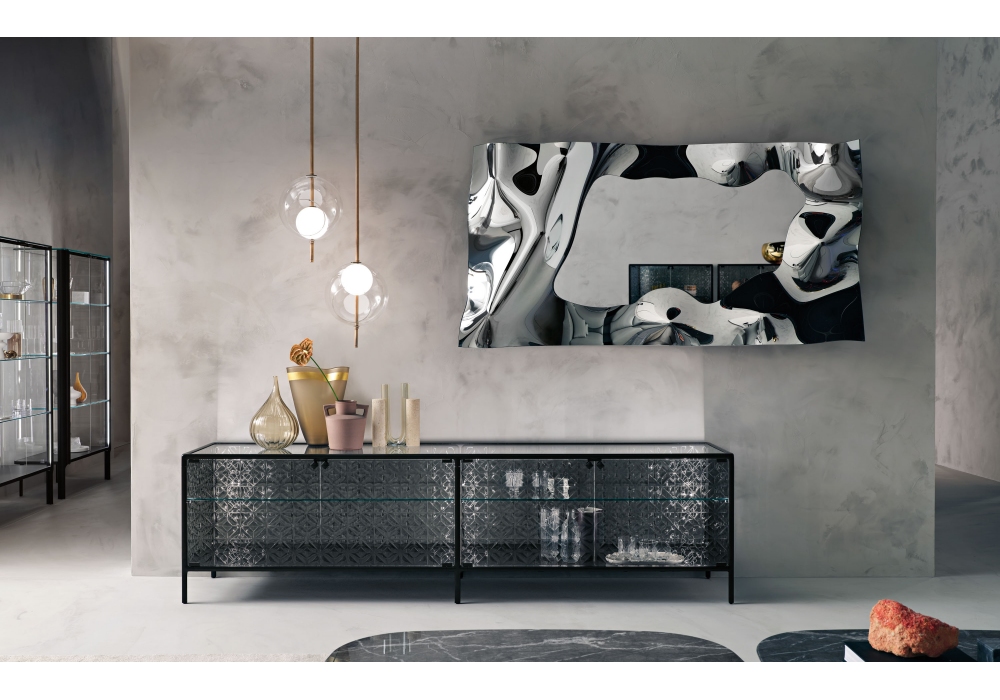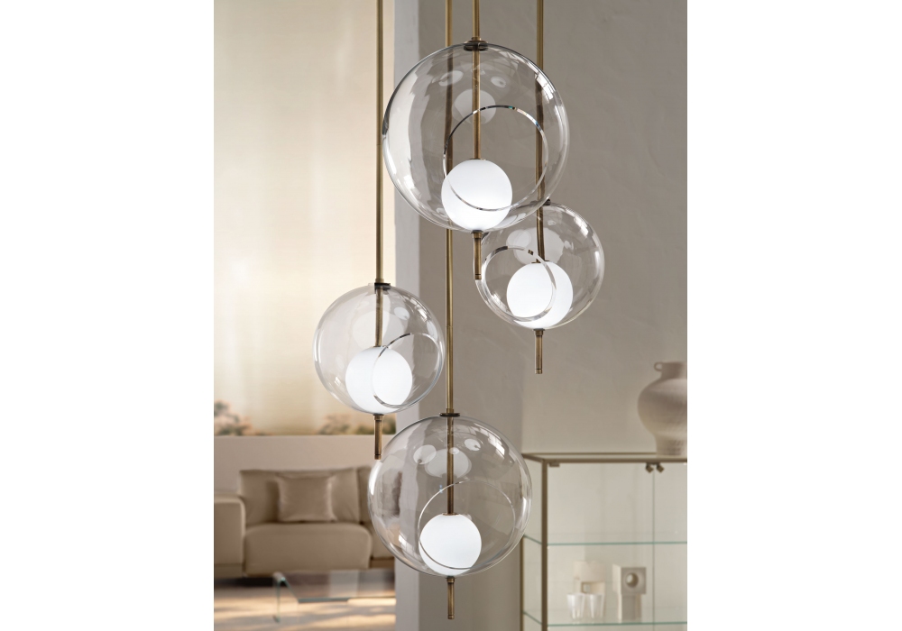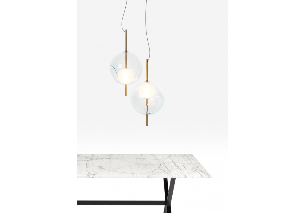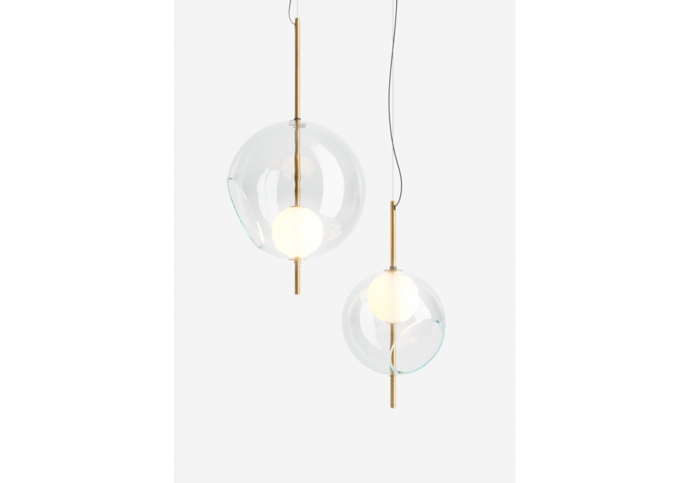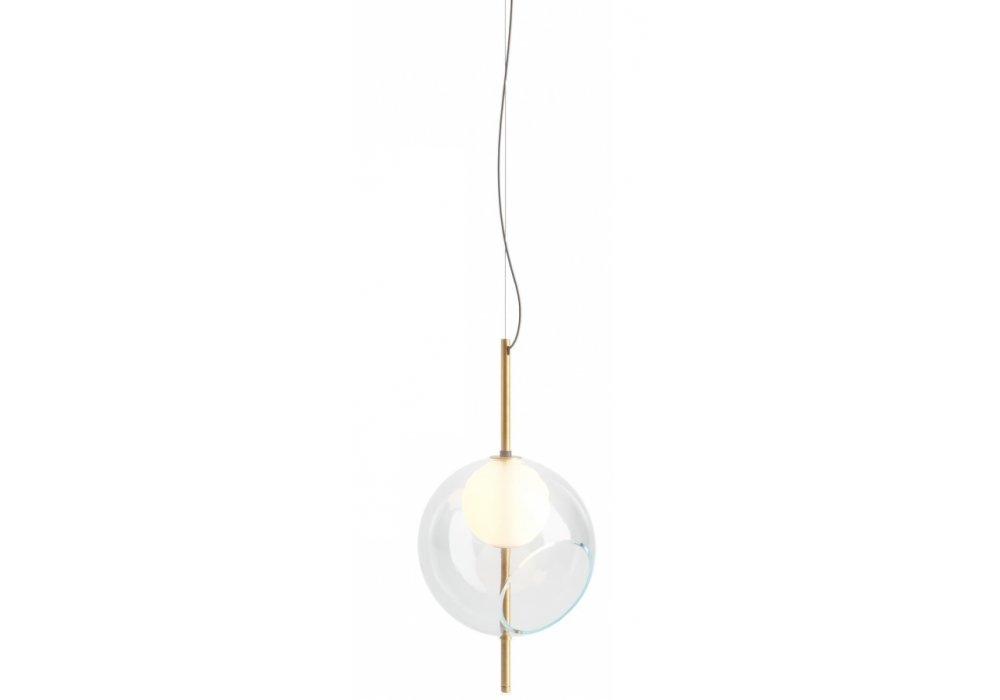 Pearl designed by Adele Martelli for Fiam is a LED suspension lamp with a metal structure in burnished brass finish. The external sphere is made of transparent Murano blown glass, while the internal one, which acts as a diffuser, is in opal white blown glass.