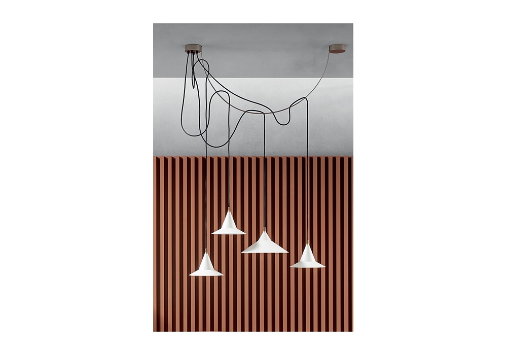San designed and produced by Bonaldo is a suspension lamp with soft touch metal shade, white or gray. The structure is in pearl beige metal. Available with 3 or 4 elements.