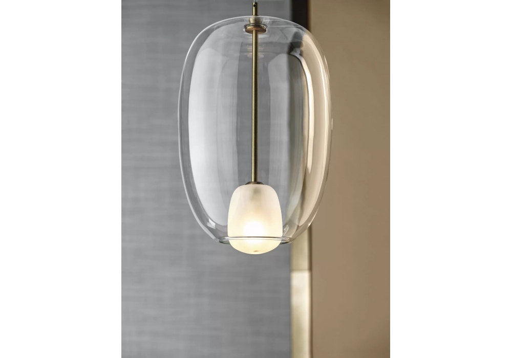 Blow designed by Eleonora Carpineti is a suspension lamp with frame and canopy made from natural brass and glass lampshade.