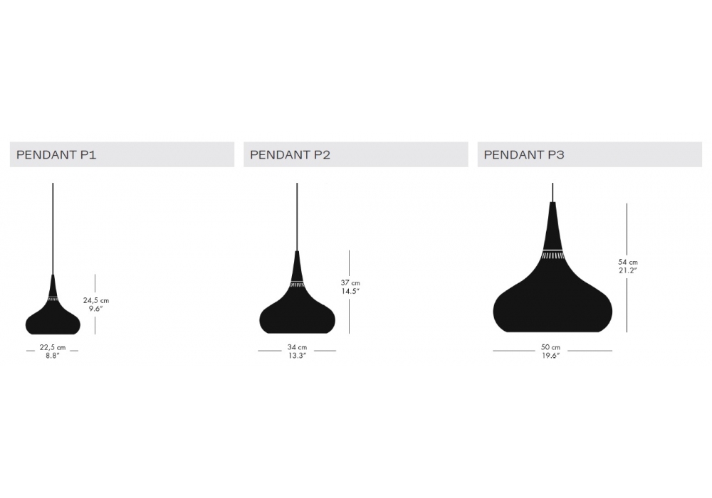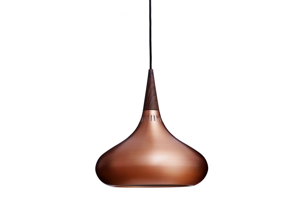 Orient™ designed by Jo Hammerborg for Fritz Hansen is a pendant lamp made with an aluminum or copper lampshade connected to the cable with a delicate joint in oak or rosewood. Available in different finishes and dimensions.