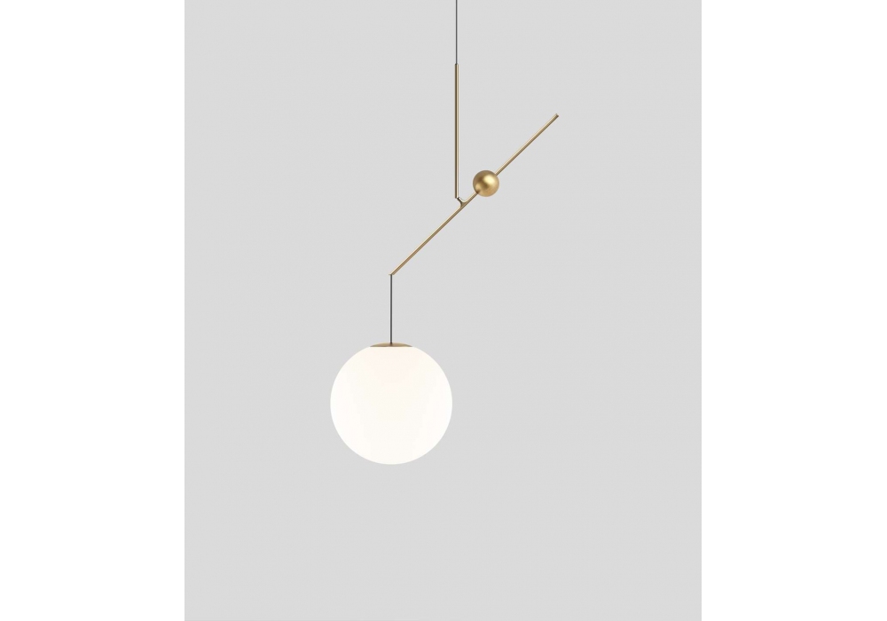 Malamata designed by Shulab for Luceplan is a pendant lamp with structure in matt black steel or brushed brass and opal white blown glass diffuser. The light can be adjusted thanks to a ball counterweight. Pressing the button above it releases a spring and the counterweight is free to slide on the arm.