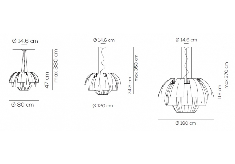 | Dimensions | • Ø 80 x H 47 cm - Hmax 330 cm; • Ø 120 x H 74,5 cm - Hmax 350 cm; • Ø 180 x H 112 cm - Hmax 370 cm |
