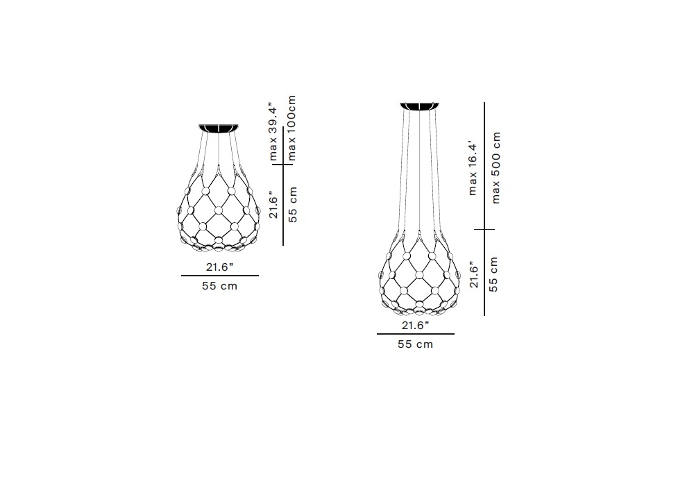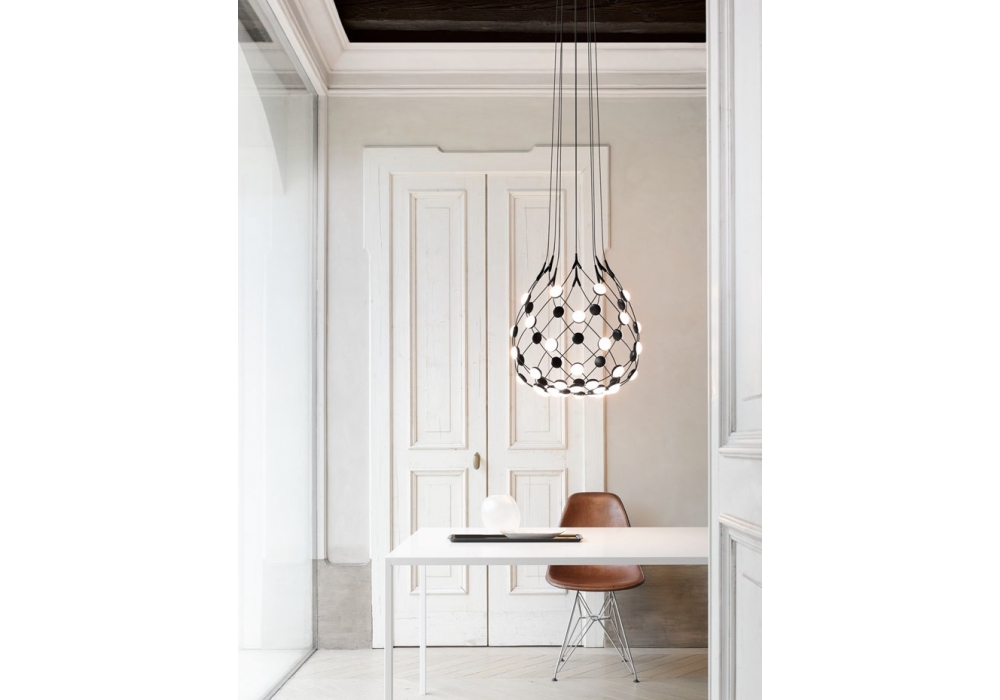 Mesh designed by Francisco Gomez Paz for Luceplan is a small pendant lamp with black steel structure and polycarbonate lenses. The lighting is controlled by means of a phase cut dimmer.
