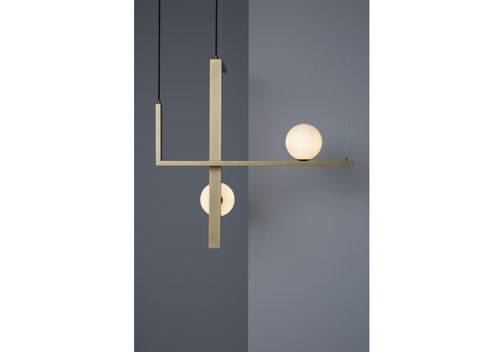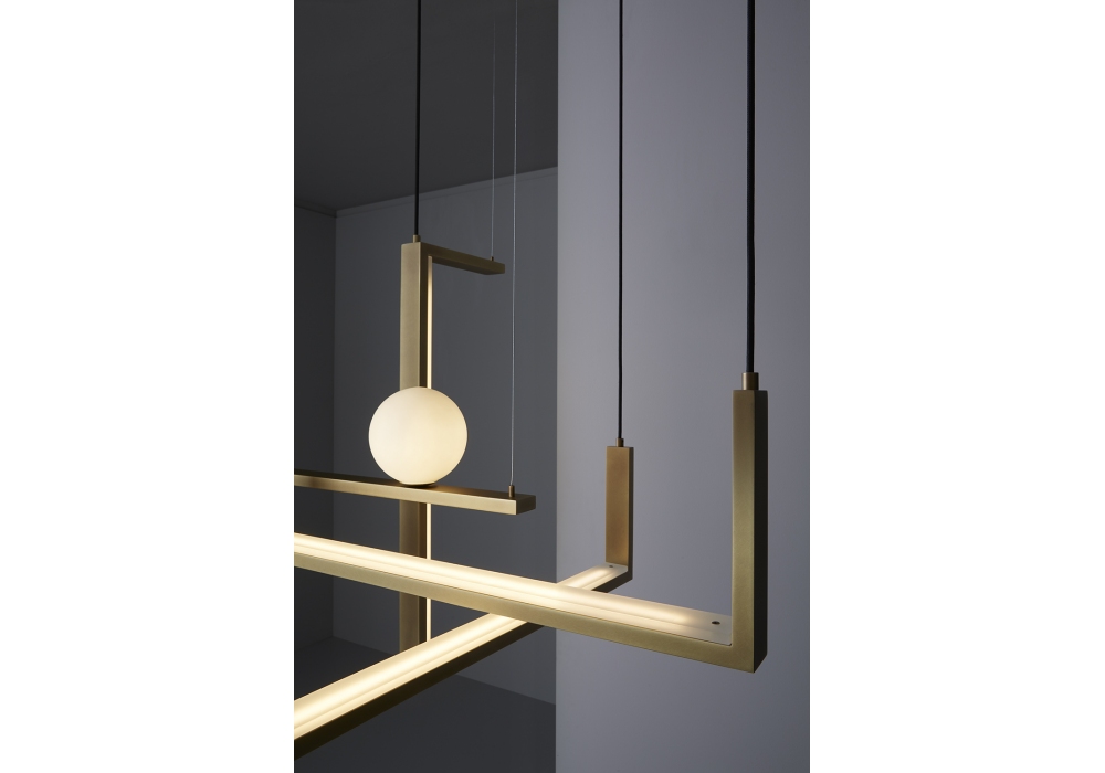 Less System designed by Massimo Tonetto for Venicem is a suspension lamp providing diffused light. Structure in natural burnished brass, glossy black nickel or matt black nickel composed of brass profiles, spheres and diffusers in satin glass. Self-supporting ropes in black fabric and steel cables with quick fastening system. Available in various compositions and sizes.