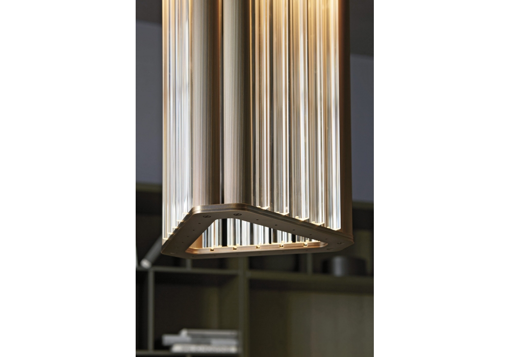 Numa designed by Massimo Tonetto for Venicem is a suspension lamp providing diffused light. Structure in dark burnished brass. Triedri in crystal, amber or smoke blown Murano glass. Dimmer kit sold separately.