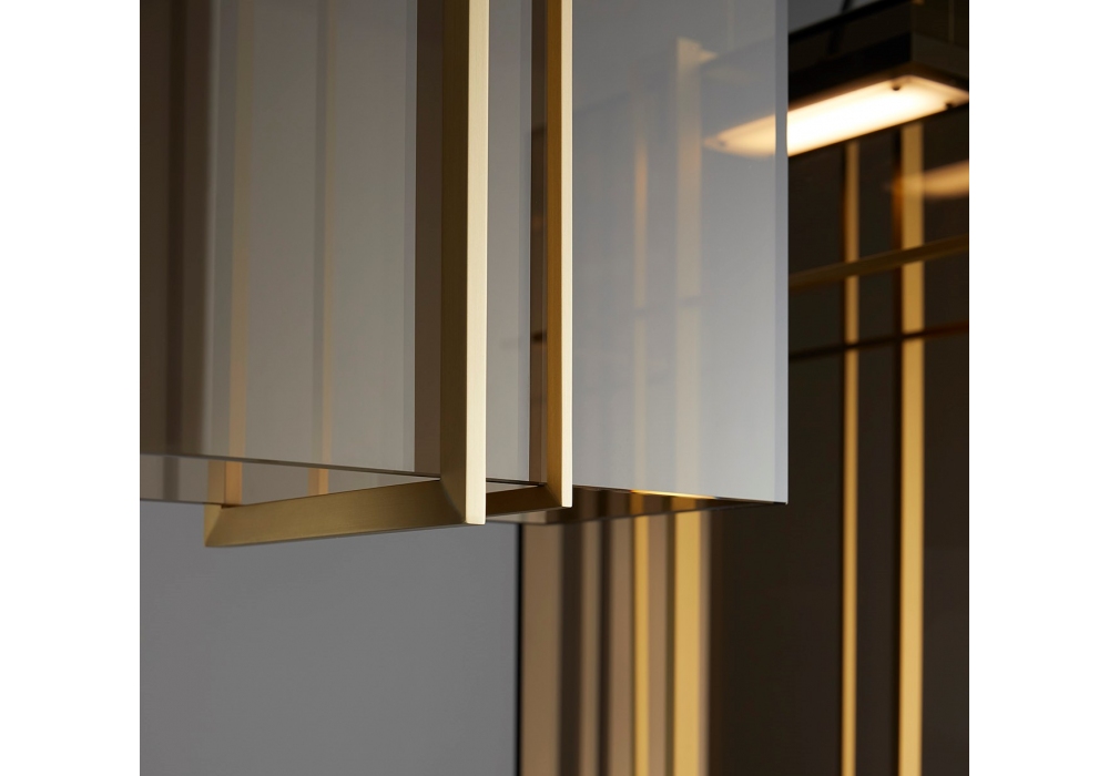 Utmost designed by Massimo Tonetto for Venicem is a suspension lamp with indirect light. Light burnished brass structure with bronze transparent glass diffuser.