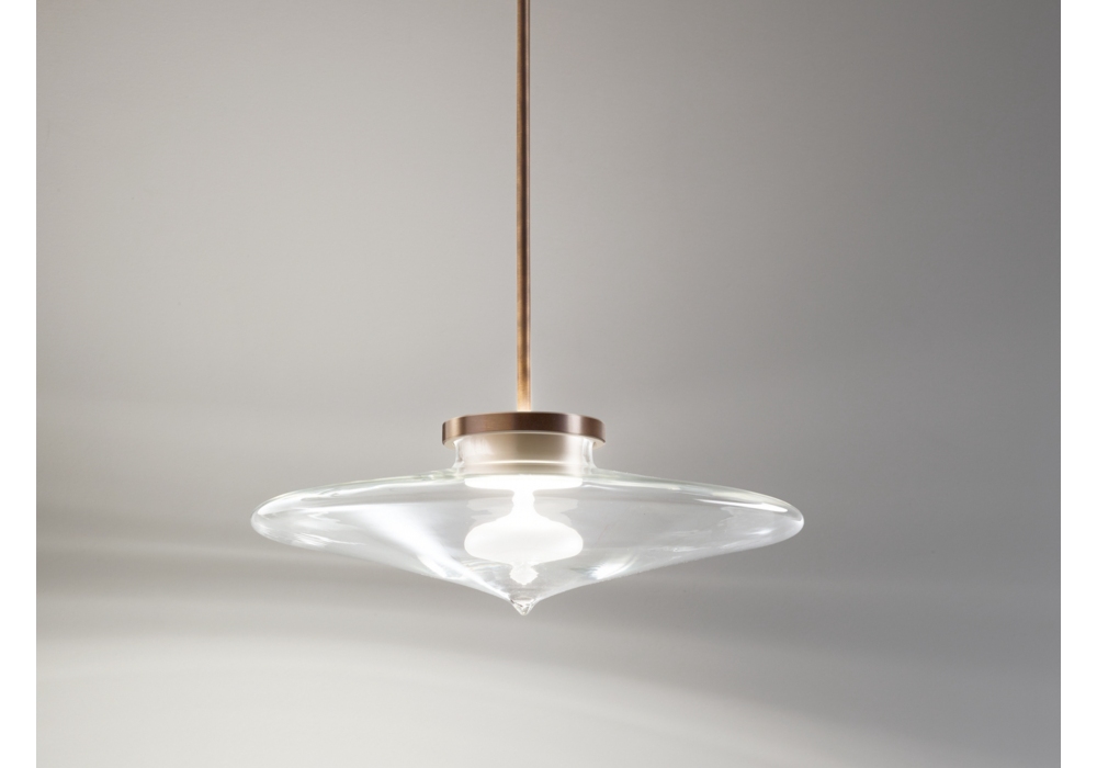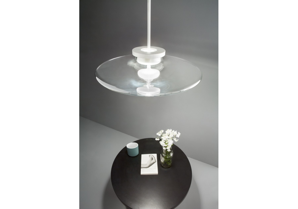 Desideria Single Rope designed by Domenico Rinaldi for Fisionarte is a pendant lamp with metal structure in different finishes. The diffuser and the lampshade are in borosilicate glass with an opaque or transparent finish and shield a dimmable LED light source.