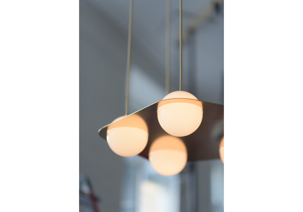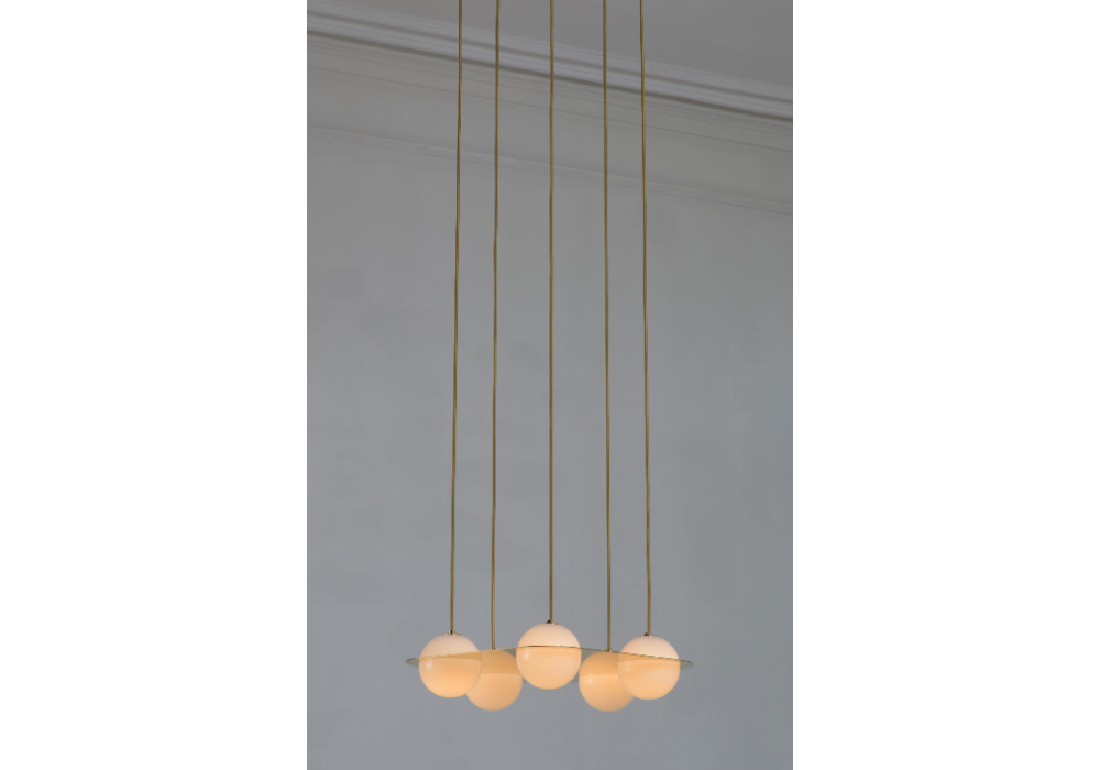 Laurent 04 designed by Guillaume Sasseville for Lambert & Fils is an LED suspension lamp. The structure is powder-coated aluminum or brass and a globe in mouth-blown opal glass. Available in different finishes.