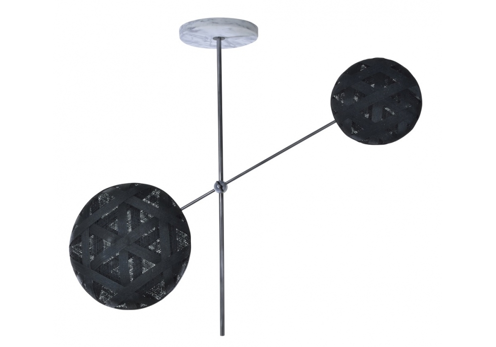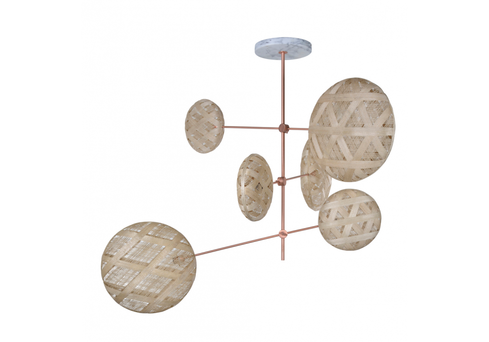 Chanpen Multiple designed by Anon Pairot for Forestier is a pendant lamp made of metal covered with an abaca cord. The 2 lights version consists of two black Ø 19 and Ø 52 cm diffusers and structure in Gun Metal finish, the 6 lights version includes 1 Ø 19 cm diffuser, 2 Ø 26 cm and three Ø 52 cm diffusers in white finish and Gun Metal structure.