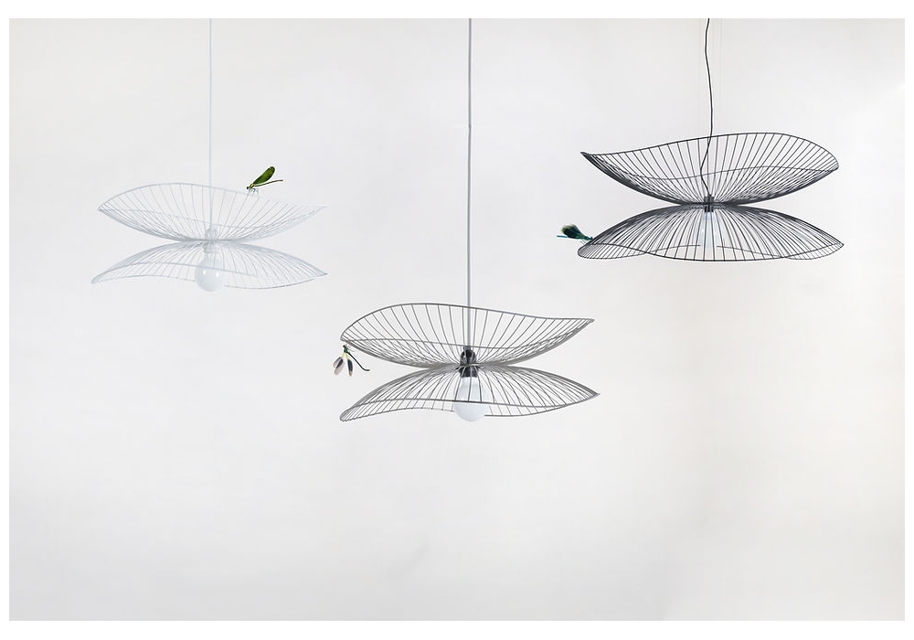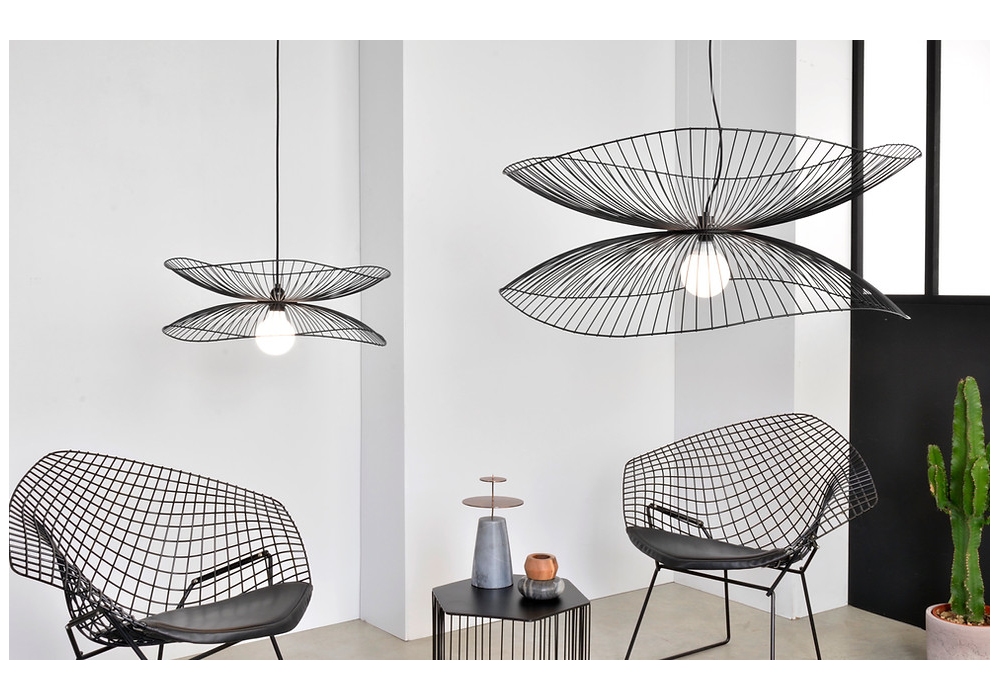Libellule designed by Élise Fouin for Forestier is a pendant lamp made of curved lacquered metal and textile cable. Available in different dimensions and finishes.