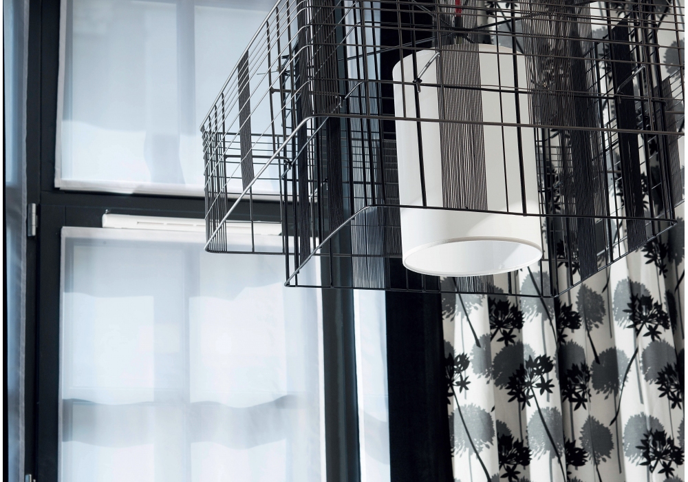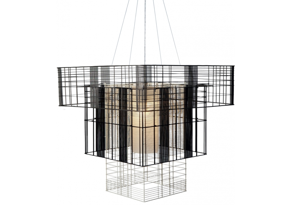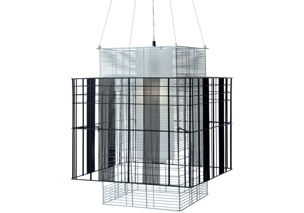 Mesh Cubic designed by Arik Levy for Forestier is a pendant lamp made with 2 metal structures, silicone cord and 4 steel cables. The M model is available in black and white finish, while L and XL in black and gray. Available in different models.