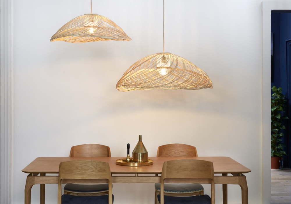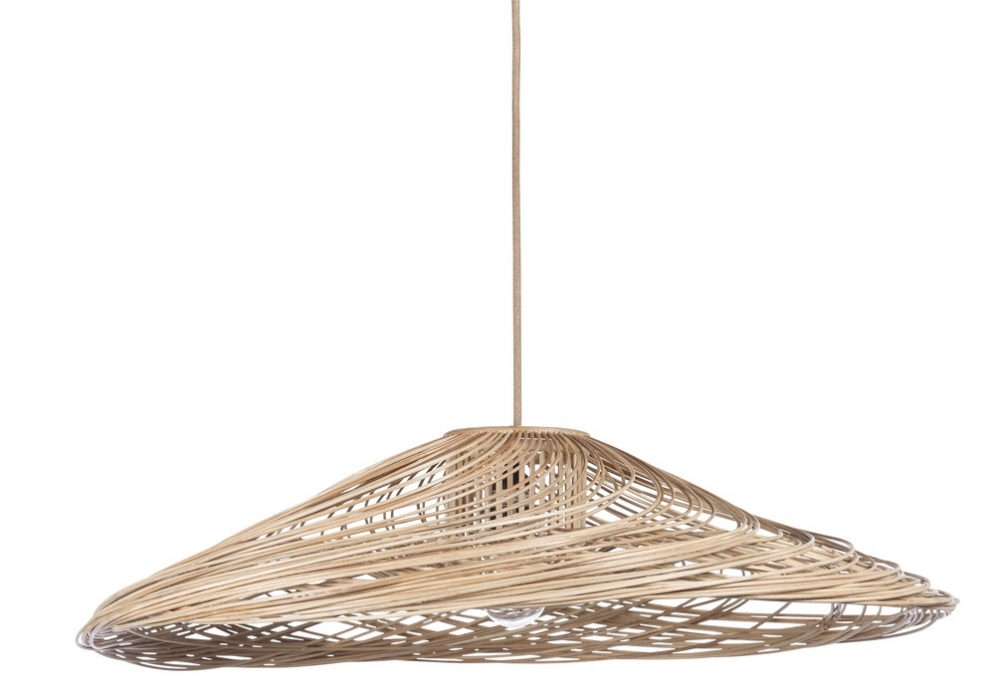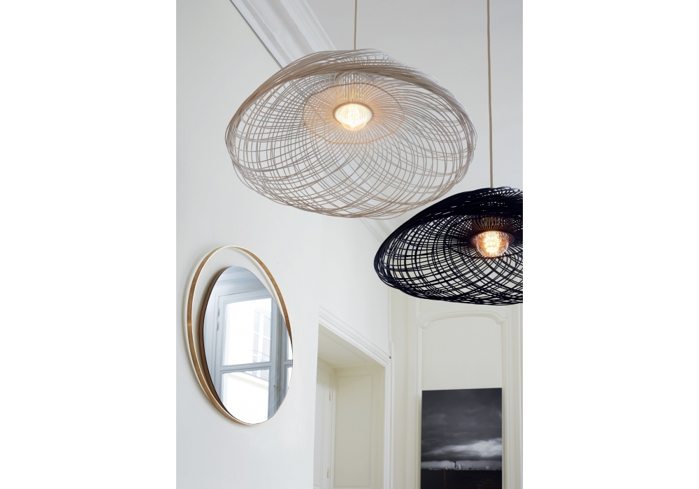 Satelise designed by Élise Fouin for Forestier is a pendant lamp made of rattan and fabric cable. Available in different finishes and dimensions.