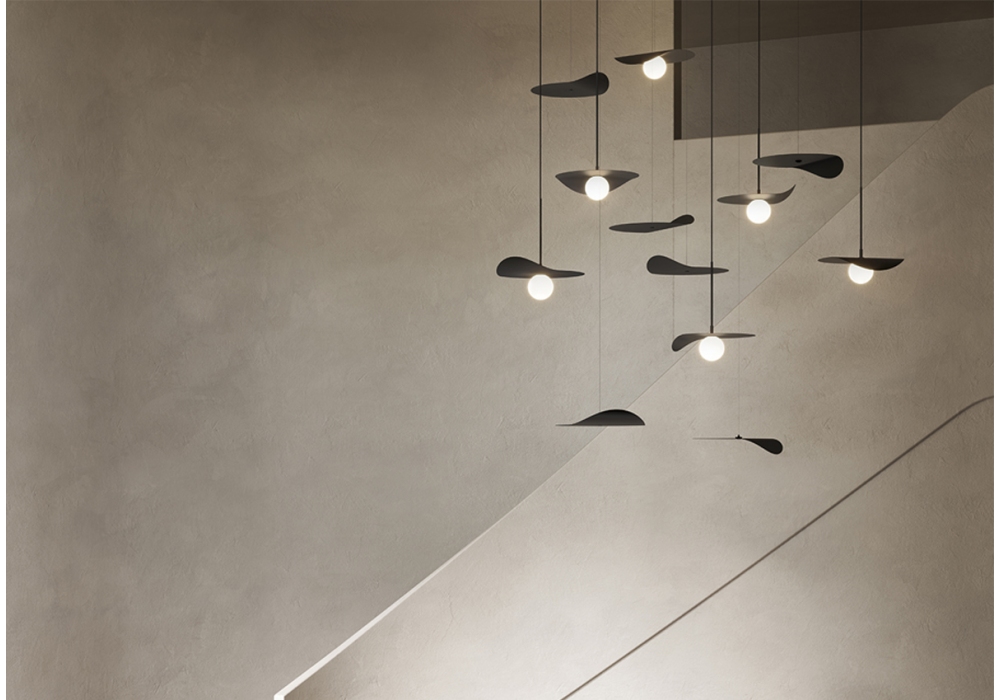 Flow designed by Chris Basias for Kundalini is a suspension lamp with diffuser in layered blown opal glass and structure in black painted metal.