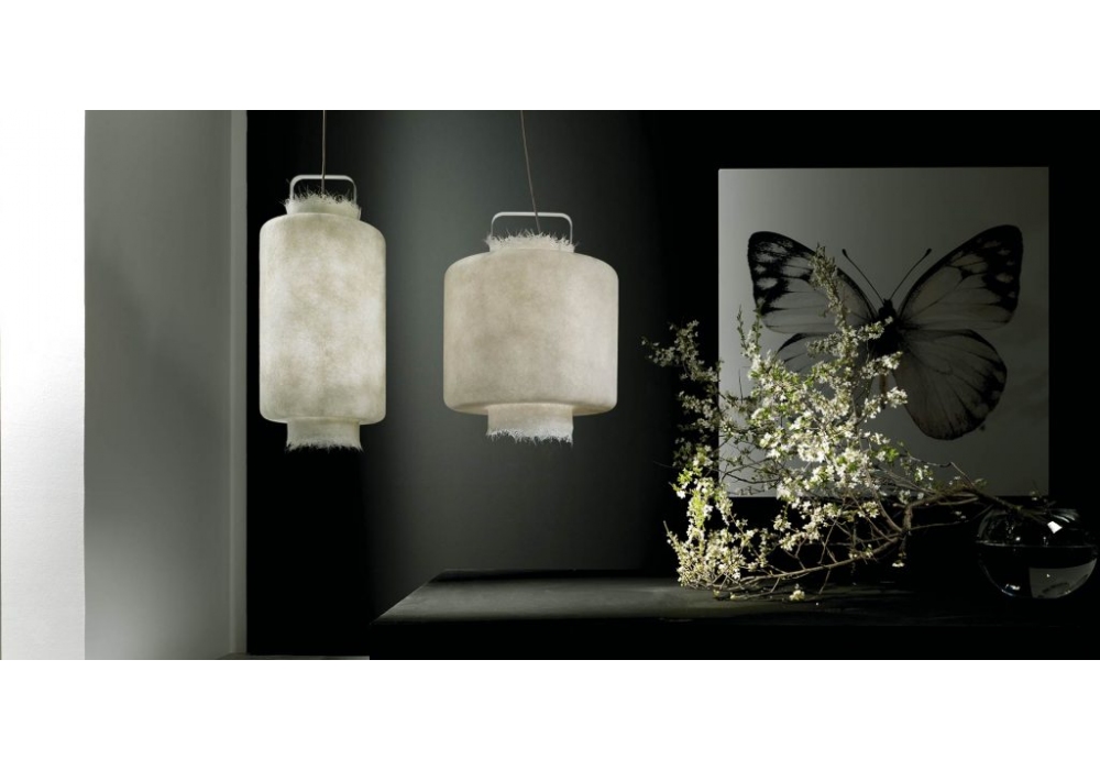 Kimono designed by Matteo Ugolini for Karman is a suspension lamp with matt white metal ceiling rose and white fiberglass structure. Available in various sizes.