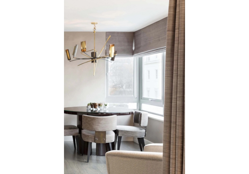 Sputnik produced and signed by Porta Romana is a chandelier with a supporting structure in bronze and brass painted metal. The lampshades are cylindrical in metal and shield a light source with a G9 type LED connection.